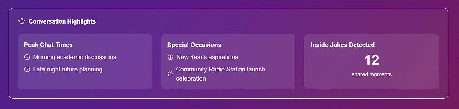 - Memorable Moments: Highlight peak interaction times, special occasions, and inside jokes.