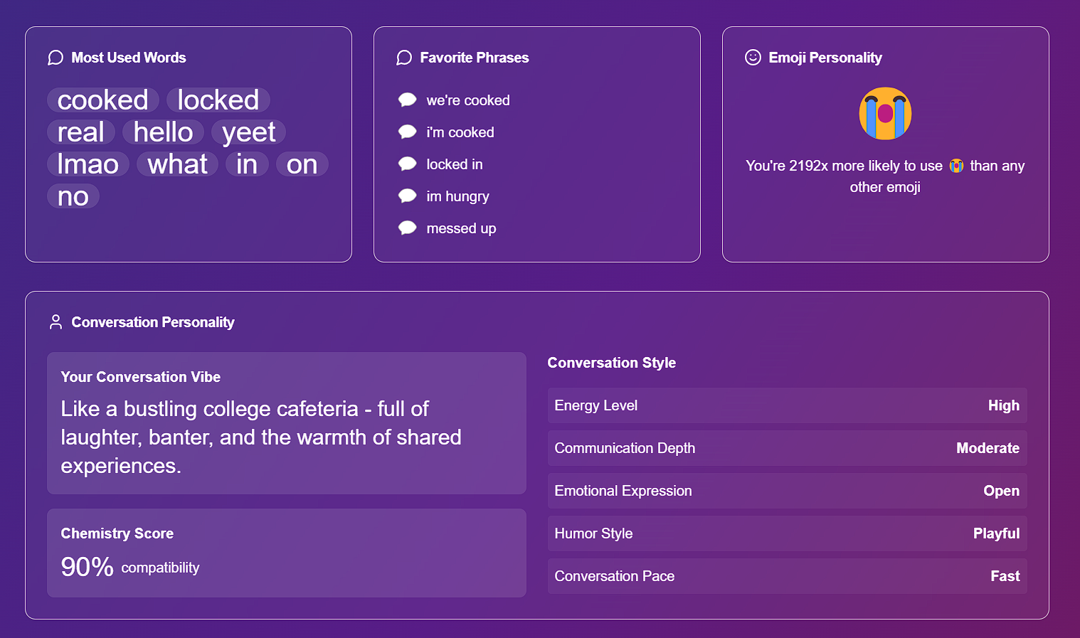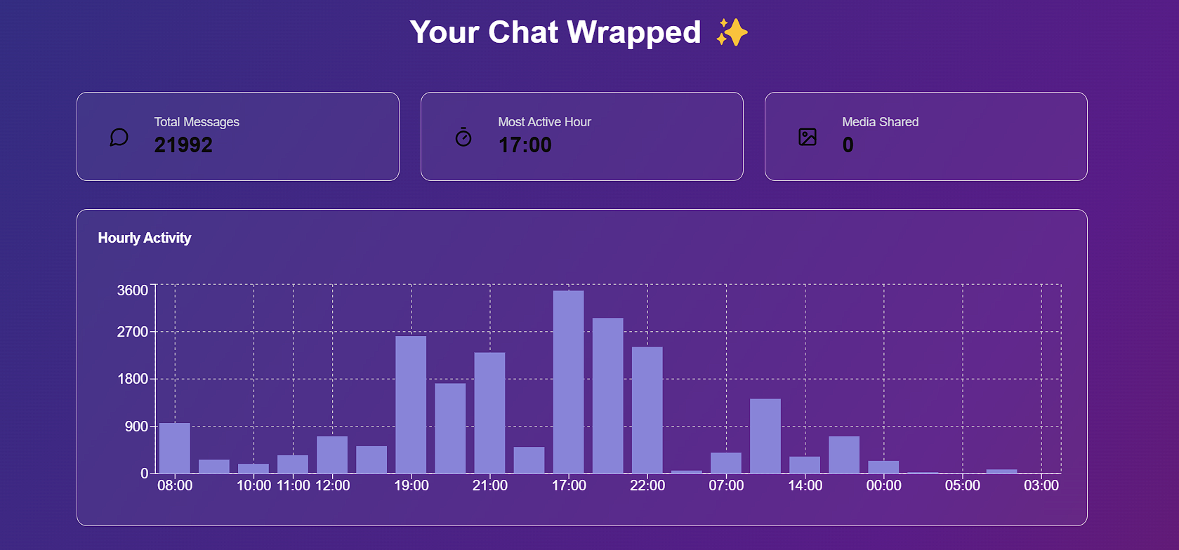 Chattron is your go-to tool for unraveling the story behind your chats. With cutting-edge text analysis and conversational insights, Chattron transforms raw chat logs into meaningful, shareable reports. Think of it as your personal "Spotify Wrapped," but for conversations. Whether you're curious about your emoji habits, your most active hours, or what makes your chats stand out, Chattron has you covered.