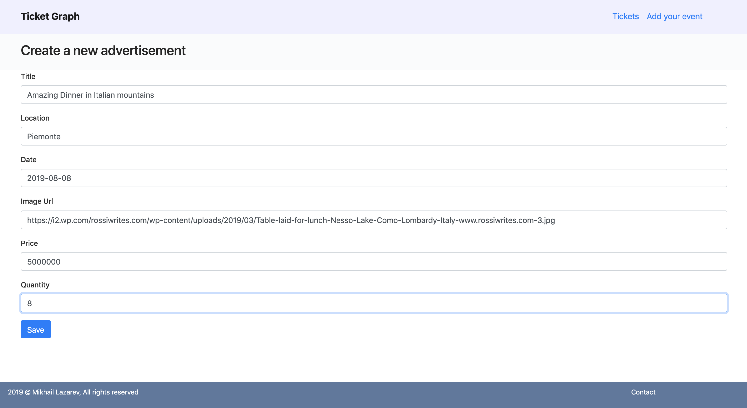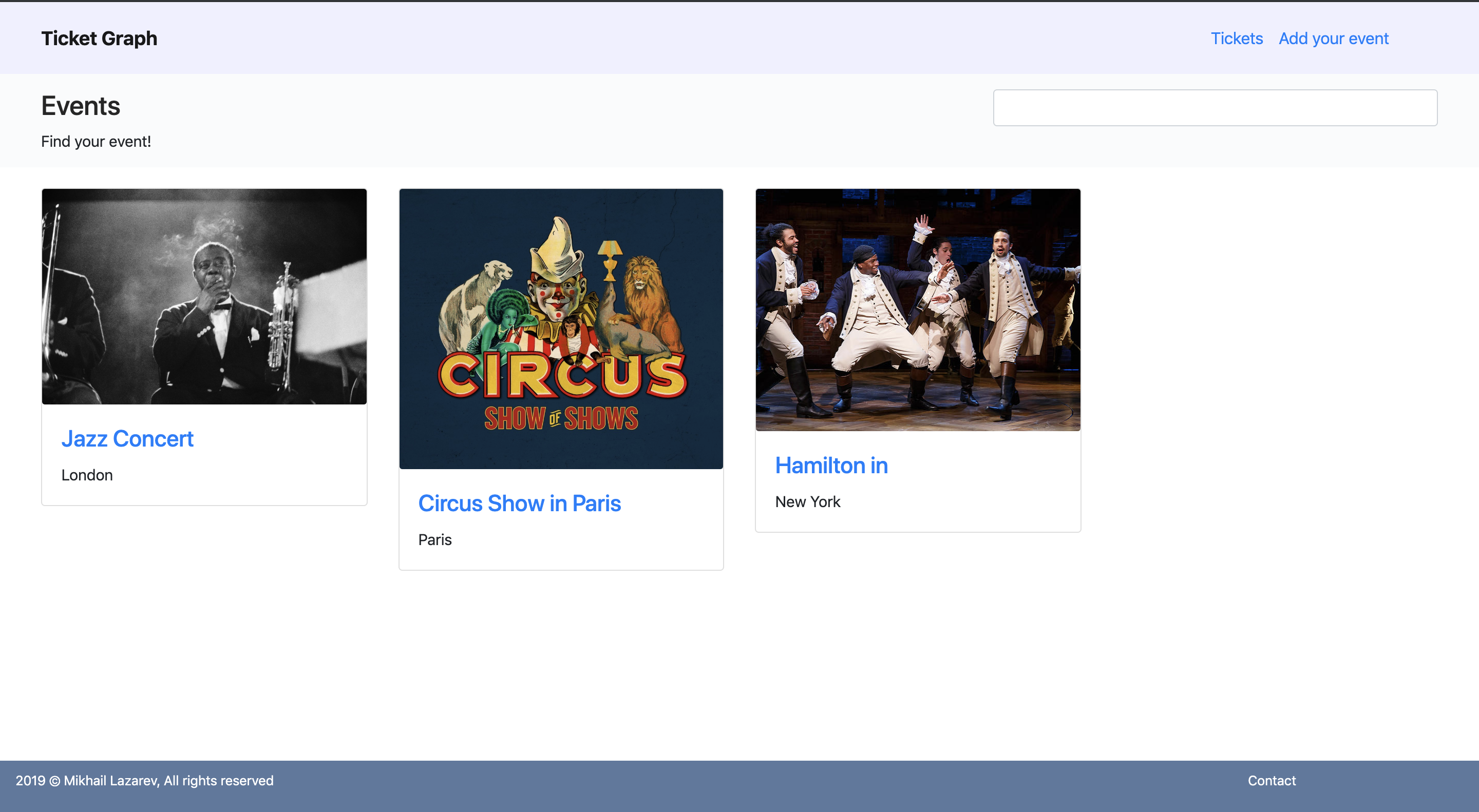 The core idea of this project is to show decentralized service where Ticket Graph users could buy tickets and event organizers could sell them. When user buys ticket his/her Ethereum address appears in the list of participants and if user has installed Ethereum wallet in mobile devices noting more to enter needed.