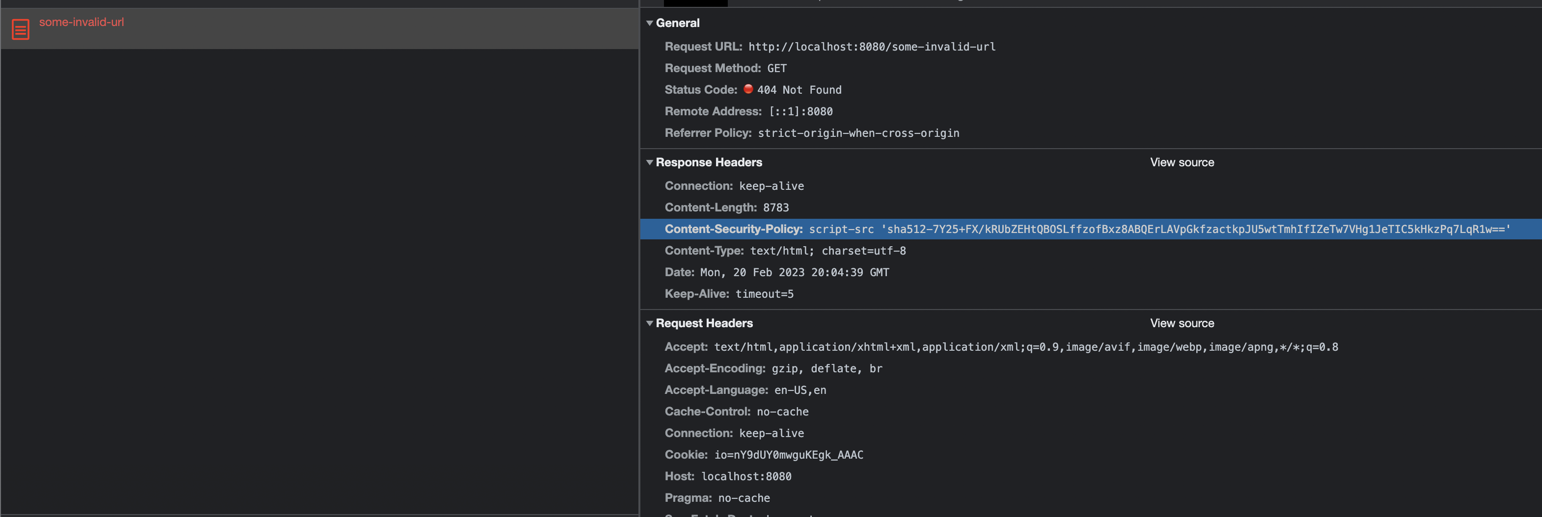 When serving the custom 404 page by calling a non-existing url, the Dev Server responds with a Content Security Policy header. This blocks some content like JS files.