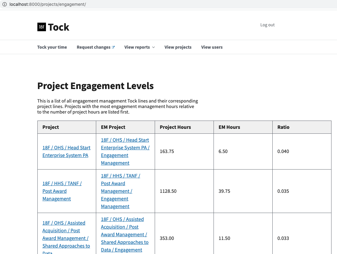 projects/engagement. It lists only active projects that have "matching" engagement management lines where matching means the engagement management line ends with "Engagement Management" and it starts with the full name of another project line. (This does miss some pairs where they don't use exactly the same names.)The total number of hours billed for the project and EM line are computed and the projects are listed in descending order of the ratio of those hours (more relative engagement management time is listed first).