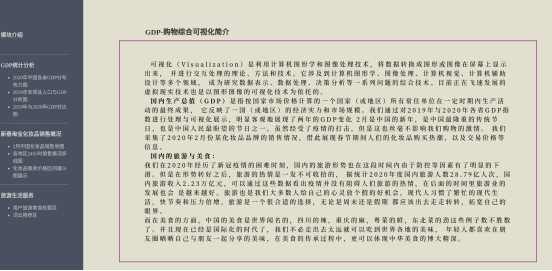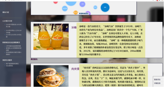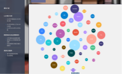 本项目使用flask框架,使用了天猫化妆品数据集、2019-2020各省gdp情况、美食景点数据集,使用echarts对数据进行可视化处理。网页整体分为四个部分:整体模块介绍,GDP统计分析模块,新春淘宝化妆品销售概况模块和旅游生活服务模块组成。使用了javascript,html和css等工具进行前端开发,使用了jQuery与ajax发送网络请求,根据用户点击日期动态展示2021年春节期间的化妆品全国销量,其中echarts版图根据前端的点击实现与后台动态获取数据后再进行展示,旅游生活服务模块使用了词云图并且加入了推荐算法根据用户的点击为其推荐相关的若干服务信息。