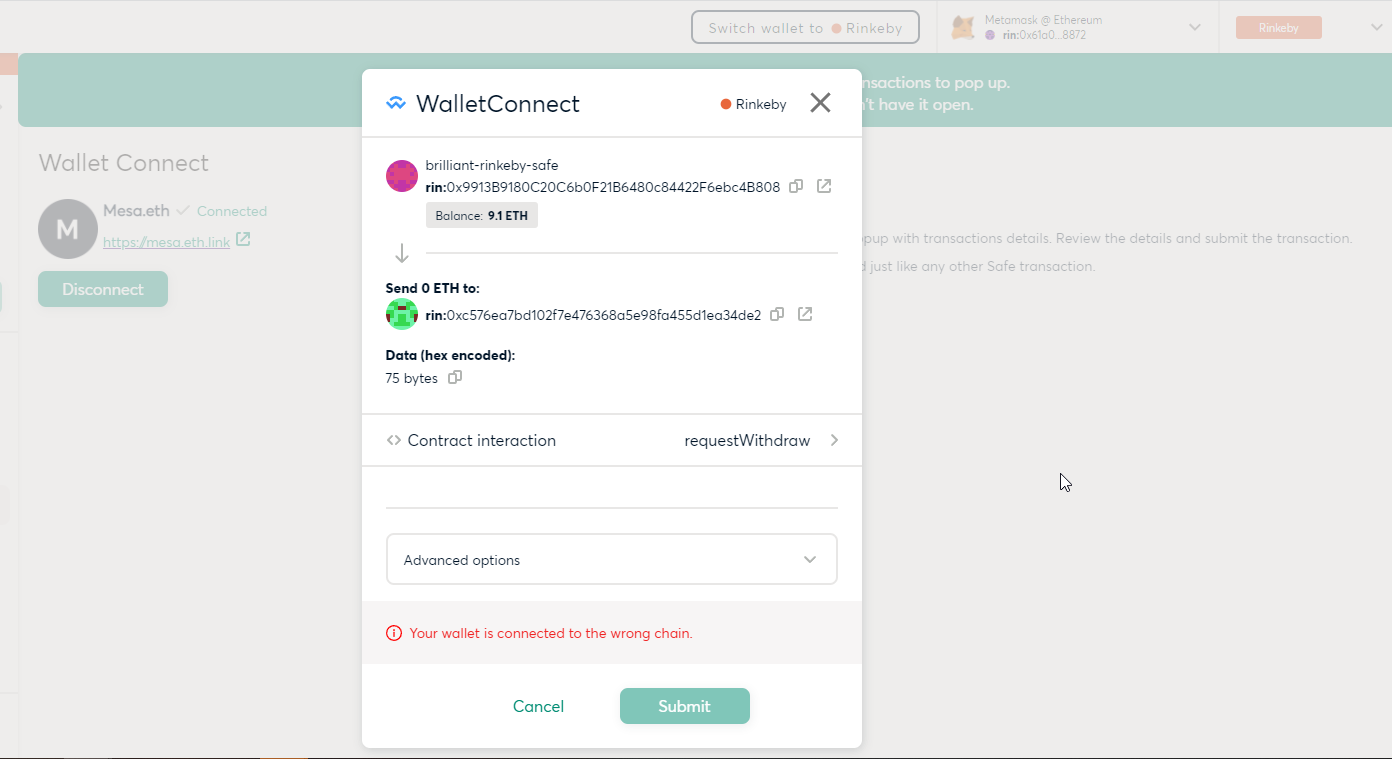 Looks good to me. I used an app called Mesa.eth Tried to switch back to the Correct network (rinkeby in this case) and tx worked as expected |