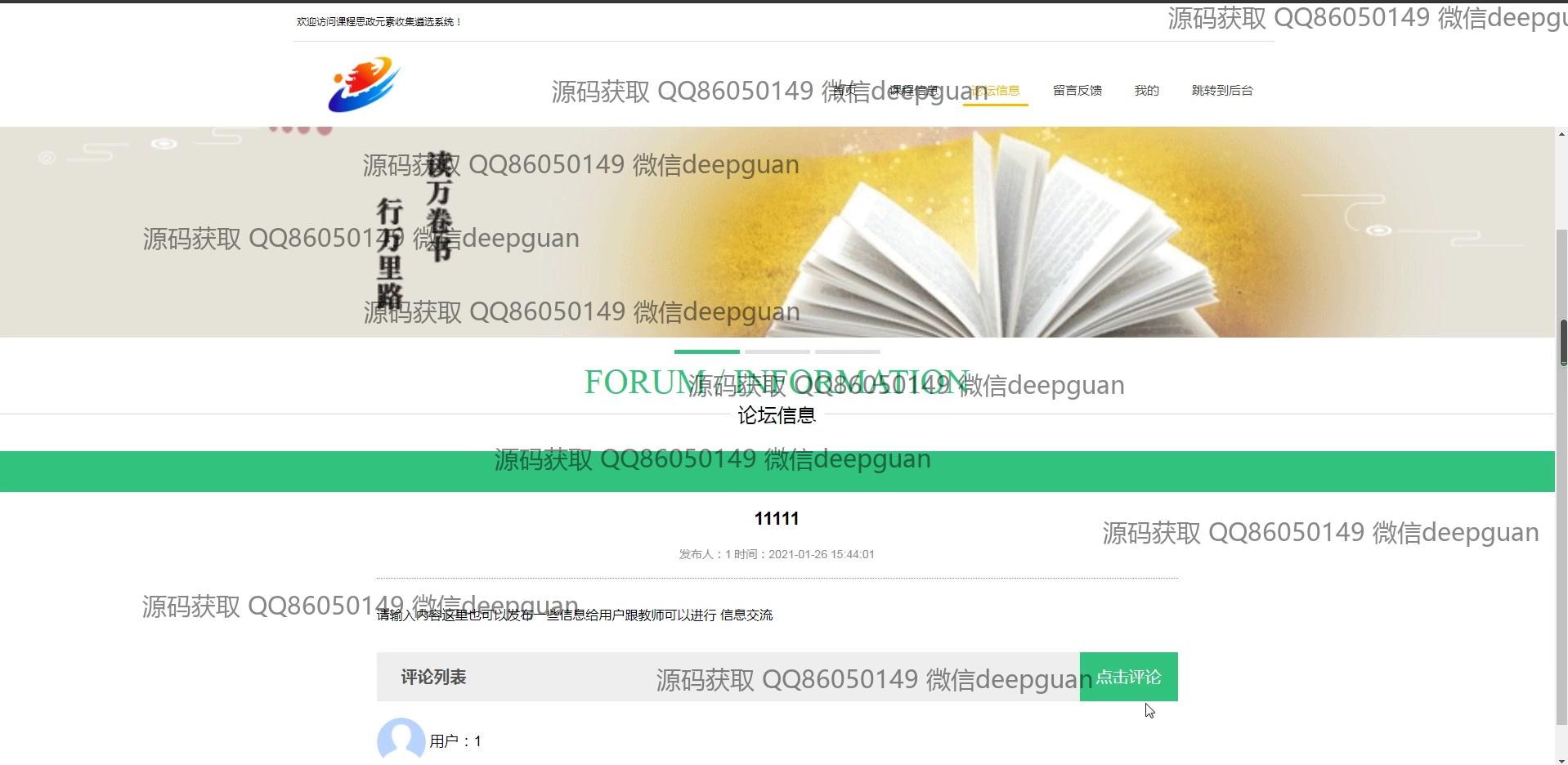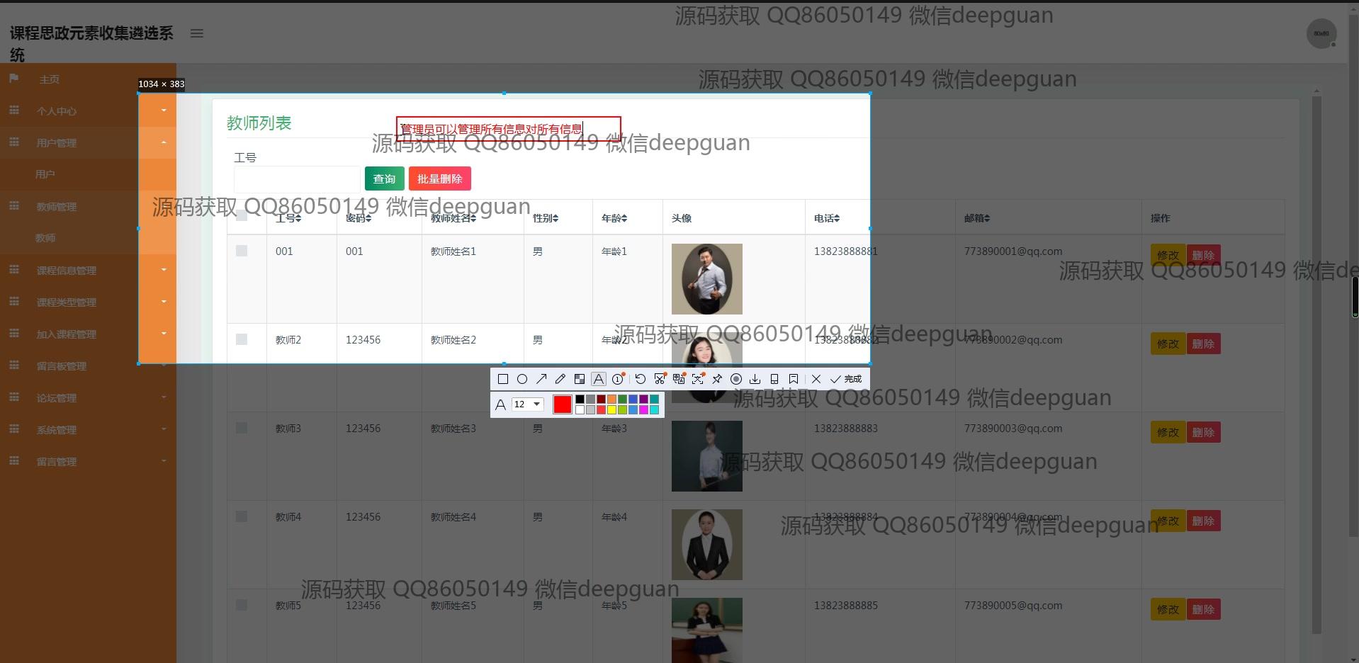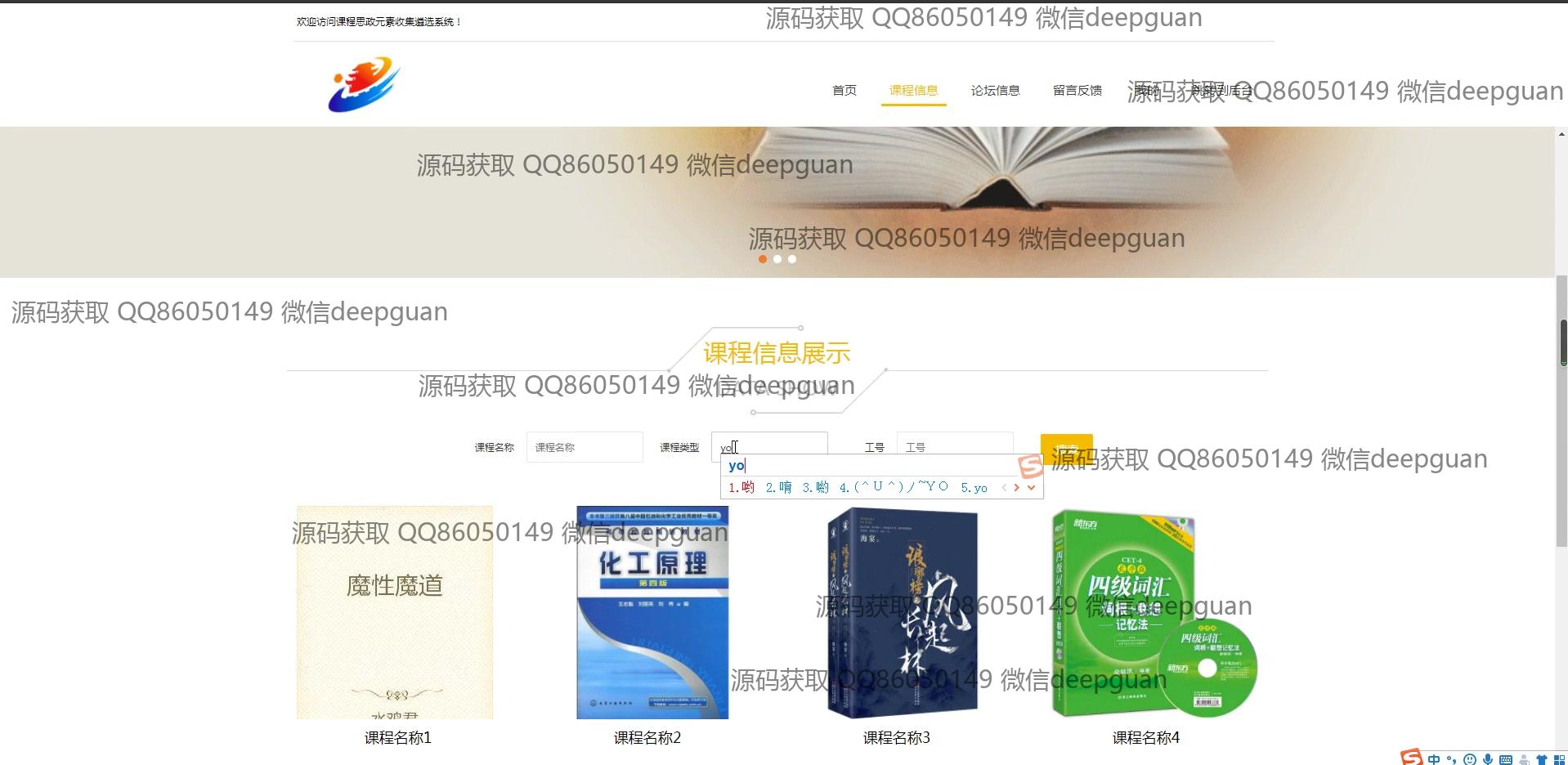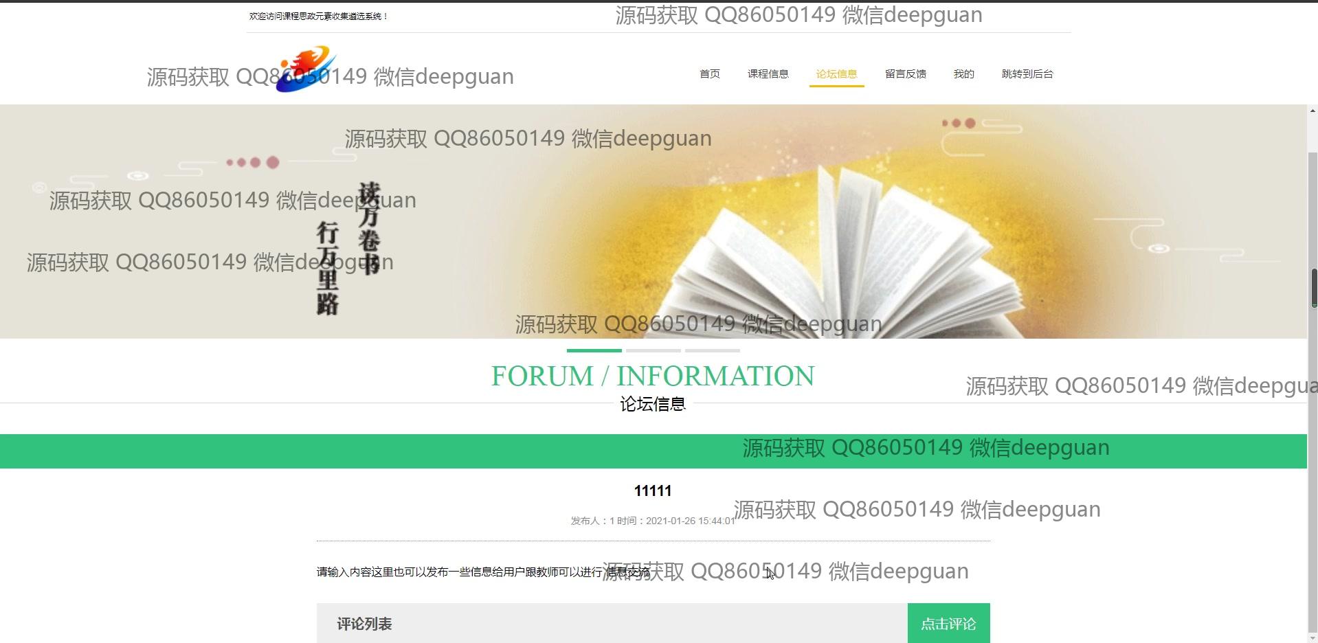 课程思政元素收集系统:角色分为管理员、教师、用户;支持课程信息管理、课程类型管理、论坛互动、留言反馈、用户管理及思政元素筛选编辑功能。 --计算机毕业设计源码;毕设源码;java毕业设计源码