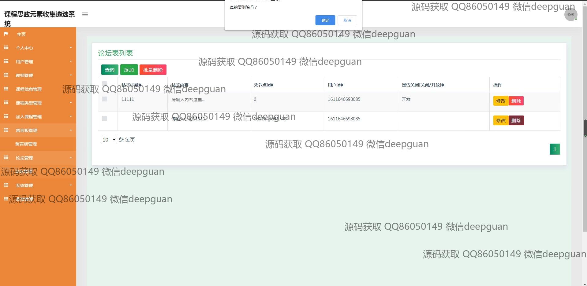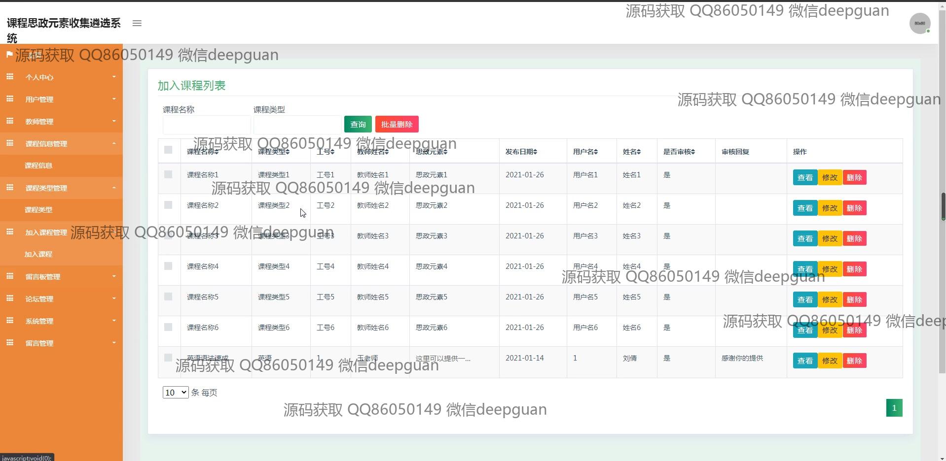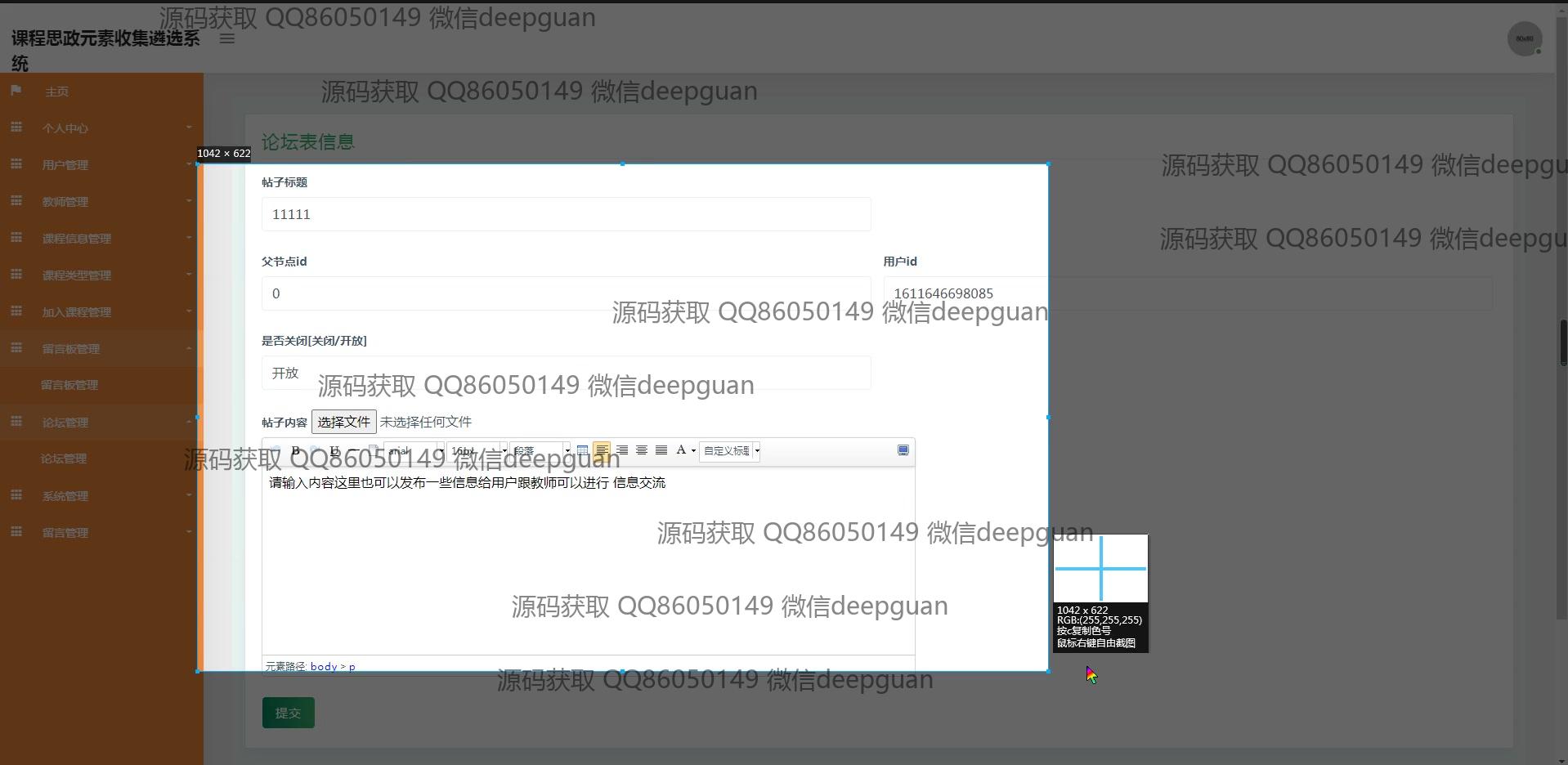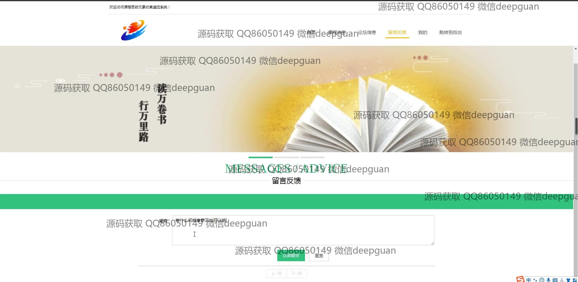 课程思政元素收集系统:角色分为管理员、教师、用户;支持课程信息管理、课程类型管理、论坛互动、留言反馈、用户管理及思政元素筛选编辑功能。 --计算机毕业设计源码;毕设源码;java毕业设计源码