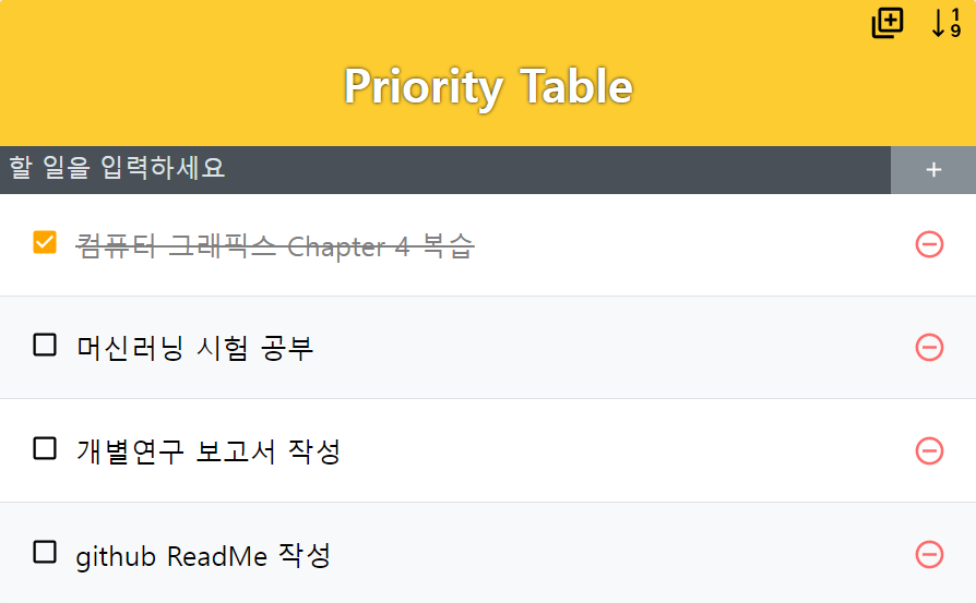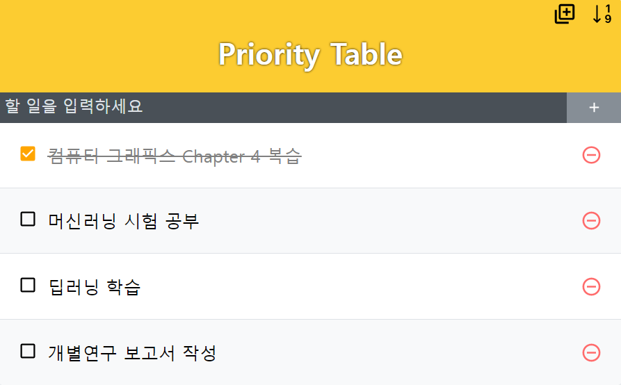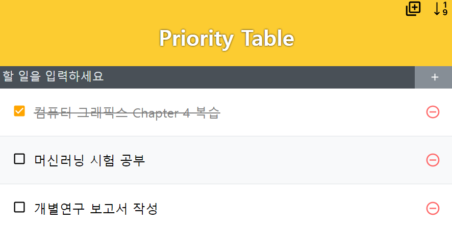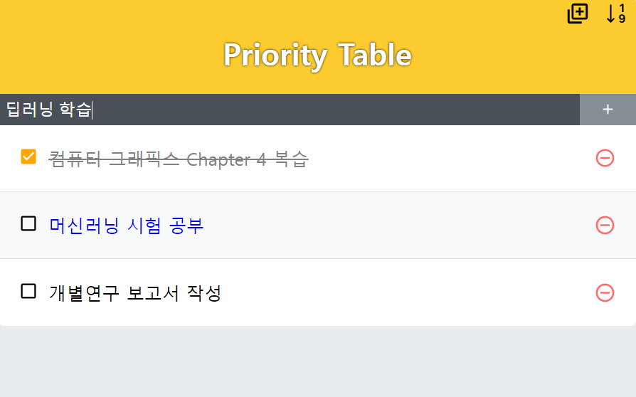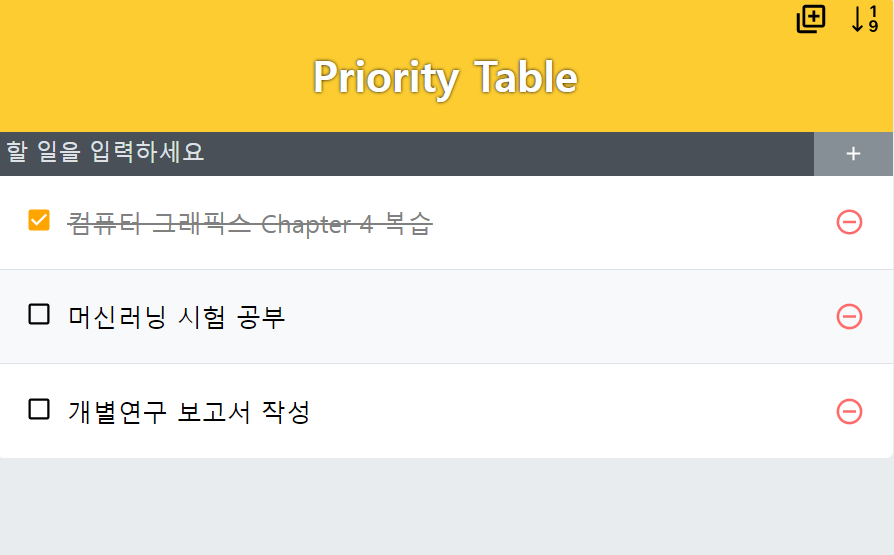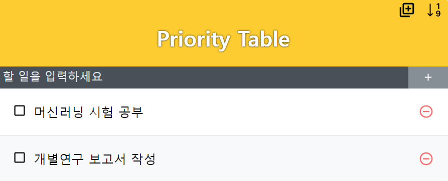 React를 이용한 간단한 업무 우선순위 관리 웹 어플리케이션으로 기본적인 추가, 삭제, 수정 기능과 더불어서 업무 진행 순서를 표기하는 Table을 따로 구현했다