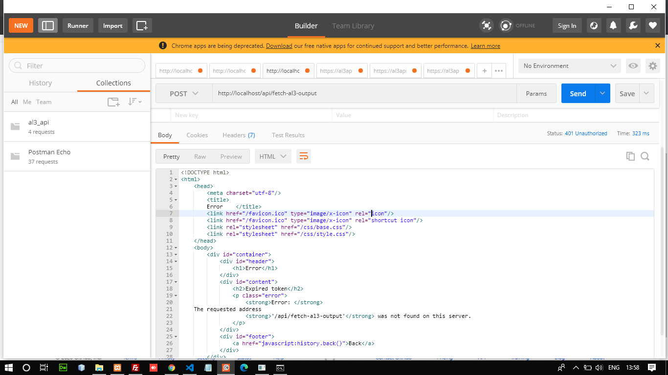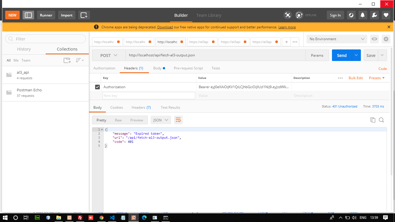 I have implemented your Admad JWT CakePHP tutorial. I'm writing the API URL like this "http://localhost/api/fetch-al3-output" without "http://localhost/api/fetch-al3-output.json". It is working fine when token not expired but it throws an error when my token got expired. it gives me an error in HTML not in JSON format