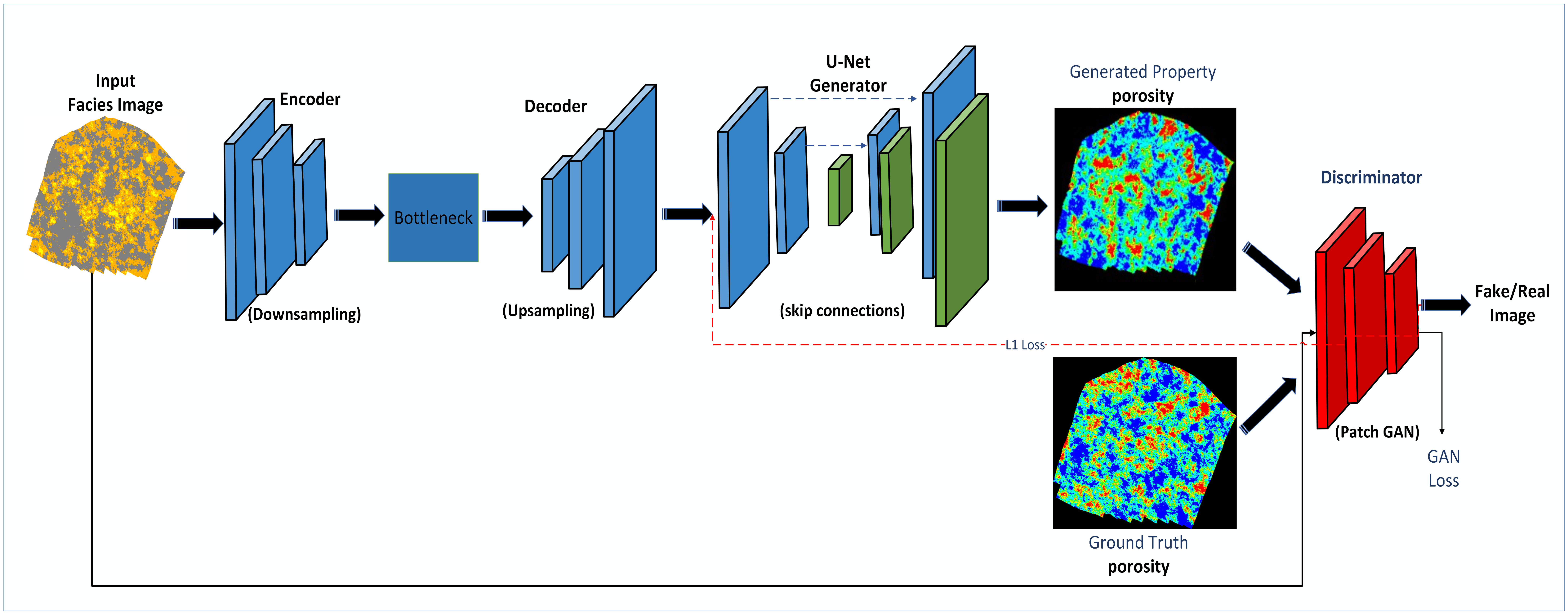 - A U-Net-based architecture designed to generate property maps (e.g., porosity, permeability) from facies input images.