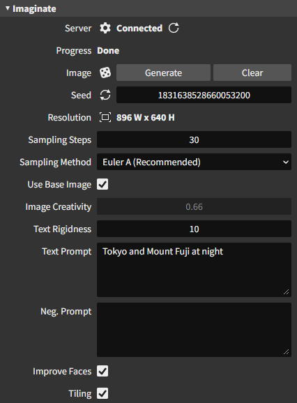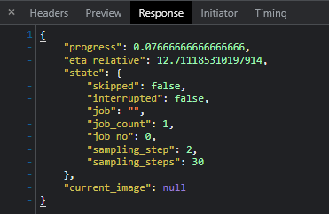 Perfect, thanks! I look forward to hooking it up as soon as I get a few hours free. Also, can this progress endpoint be used to check for server connectivity, without potentially interfering with the progress of another user that's currently generating an image? I have a feature that checks that it can reach the server when you type in an IP address/hostname, before it generates anything. I assume there isn't an actual "server status" endpoint yet which is why I am wondering if the status endpoint would be sufficient. Or if there might be any other sort of dummy endpoint, even if it returns a 400-level code at least I'd know the server exists. Ideally I'd like to also use that to query for server information, like available VRAM (so I can automatically pick a maximum resolution allowed for image generation). |