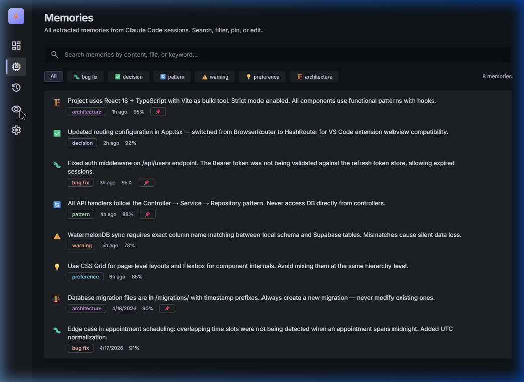 - 💉 Injects context automatically — At the start of every Claude Code session, relevant memories are injected into the system prompt