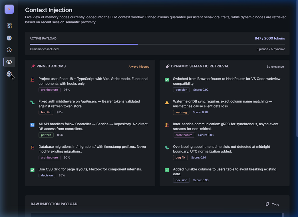 | 💉 Context Injector | Retrieves pinned + recent + semantically relevant memories, compresses to token budget, injects into system prompt |