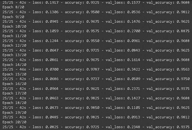 Hasilnya mendapatkan accuracy sebesar 97.25% dan untuk validation accuracy sebesar 93.75%.