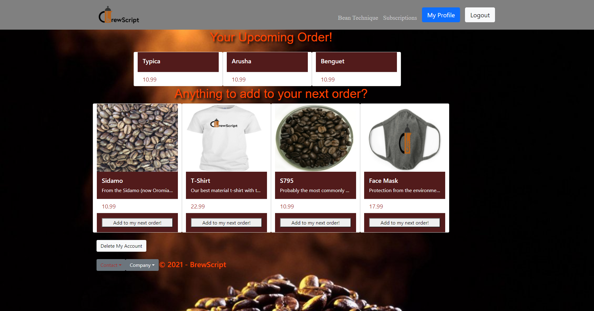 THEN I am presented with choices for numerous different types of Coffee, Coffee Apparatuses, Apparel with BrewScript Logos, and details about each item.