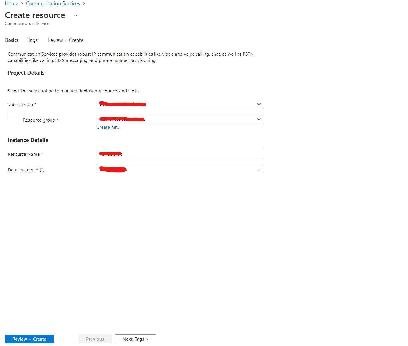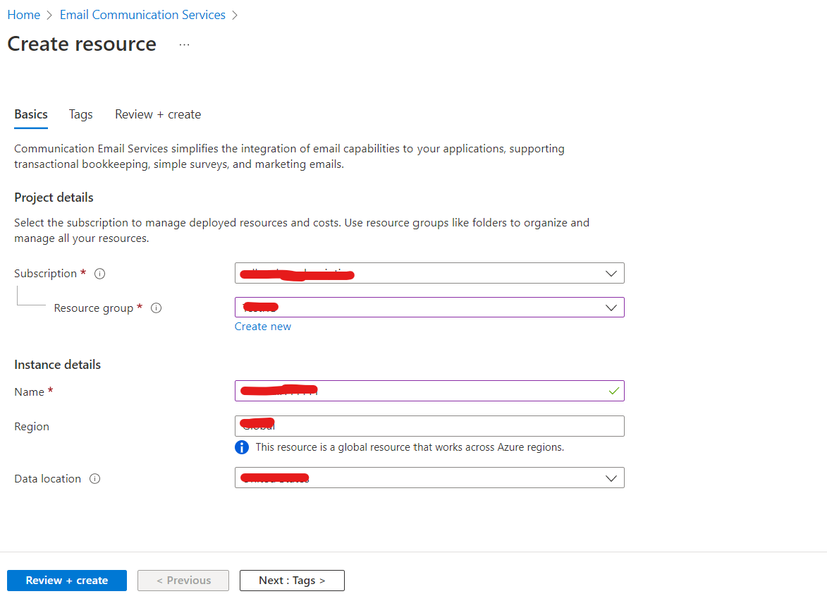 - Click on "Create", select the "Subscription", "Resource Group", "Resource Name", "Region" and the "Data Location", then click "Review + Create".