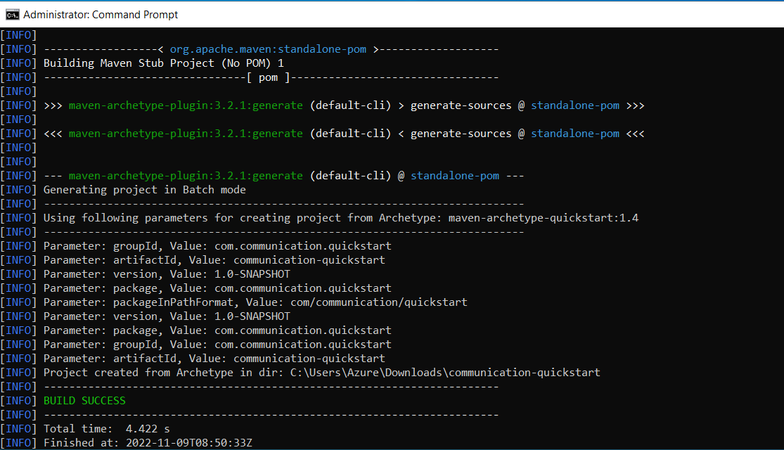 - Go to the Command Prompt, and type the following Maven command: mvn archetype:generate "-DgroupId=com.projectname" "-DartifactId=projectname" "-DarchetypeArtifactId=maven-archetype-quickstart" "-DarchetypeVersion=1.4" "-DinteractiveMode=false" and press enter.