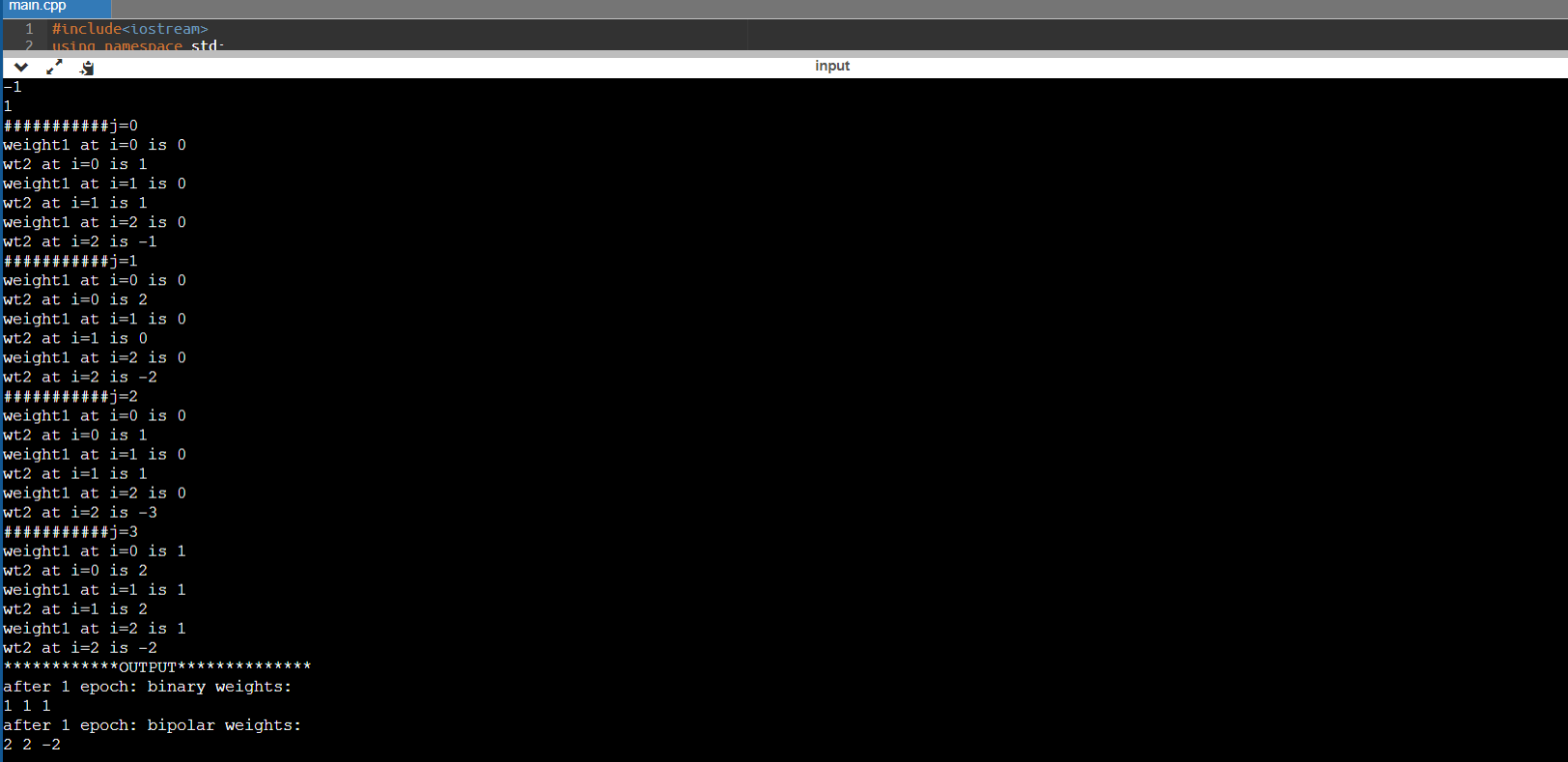Hebbian-rule-algorithm Implementation of hebbian rule algorithm in cpp Input Matrix: -1 -1 1 -1 1 1 1 -1 1 1 1 1 Binary Target: 0 0 0 1 Bipolar Target: -1 -1 -1 1