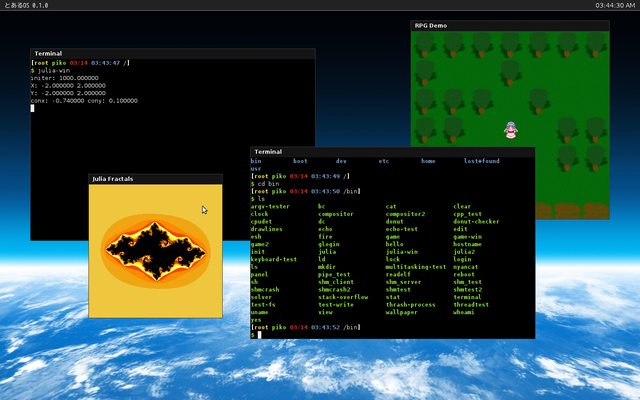 This is a toy OS based on the POSIX standards. The primary goal of the project is for me to learn POSIX from the system side, understanding the design and constructon of an operating system on x86 hardware, and build a working implementation of the C standard library. Development of とあるOS was managed by the UIUC SIGOps until May, 2012. While the ultimate goal is a microkernel, we currently have a relatively monolithic kernel.