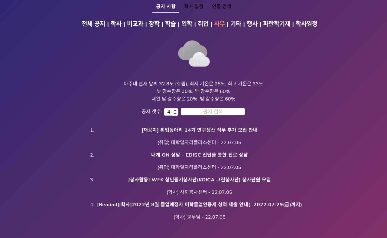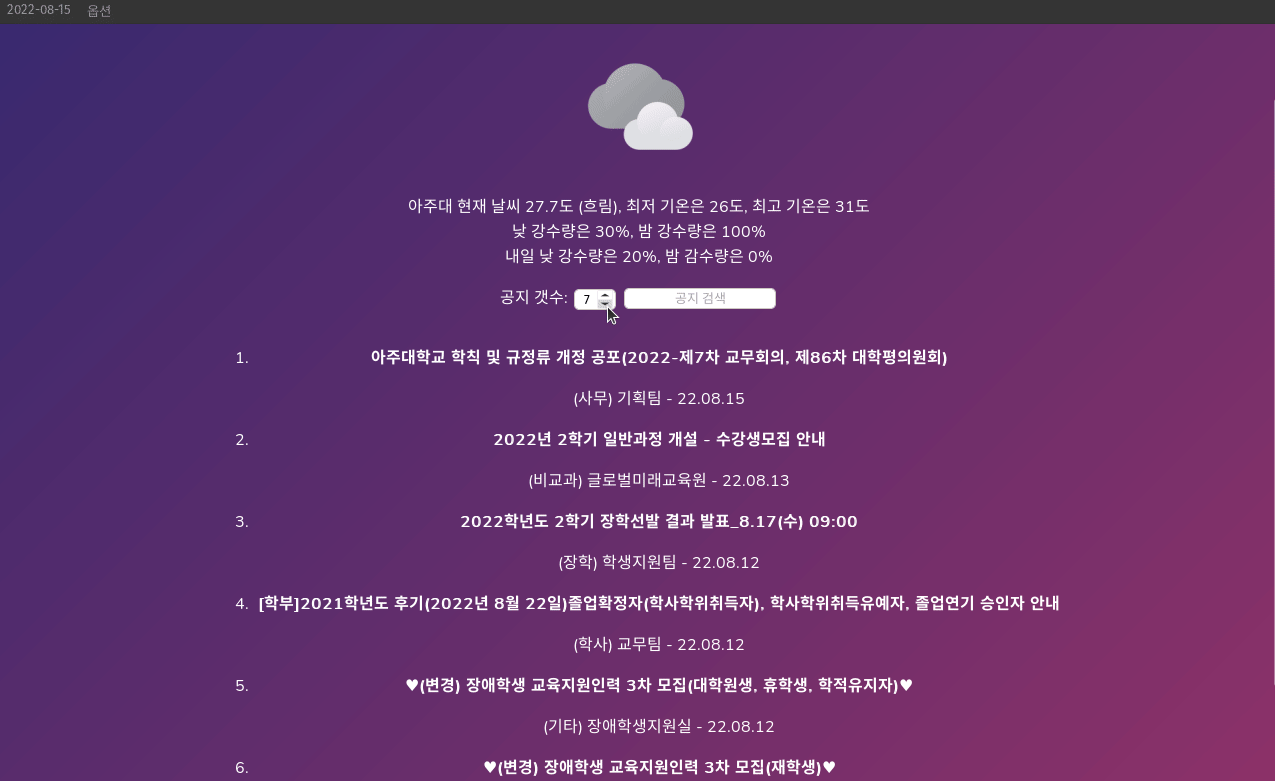 웹 앱 테스트 소개 Go + TypeScript + Svelte 를 이용한 모든 OS에서 돌아가는 앱 무엇을 개발하지는 예정 현재 아주대학교 공지, 학사일정 + 네이버 날씨 불러오는 기능으로 되어있음 빌드 Windows: wails build -upx -platform=windows