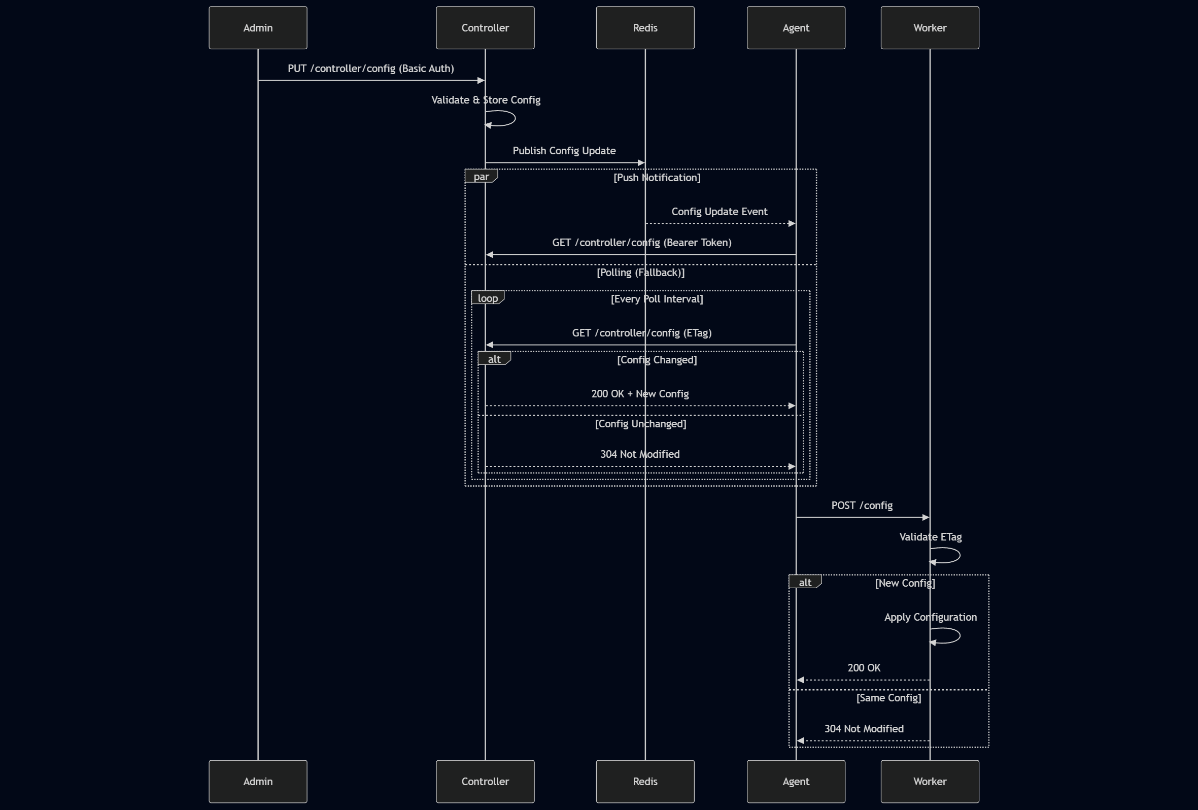 - Agent: Polling service that bridges Controller and Worker, fetching and forwarding configuration updates