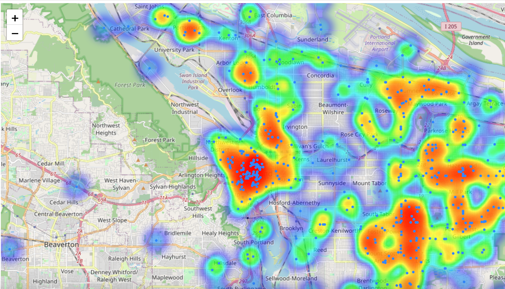 Here's a heatmap using folium of some city of Portland crime stats (https://www.portlandoregon.gov/police/71978):