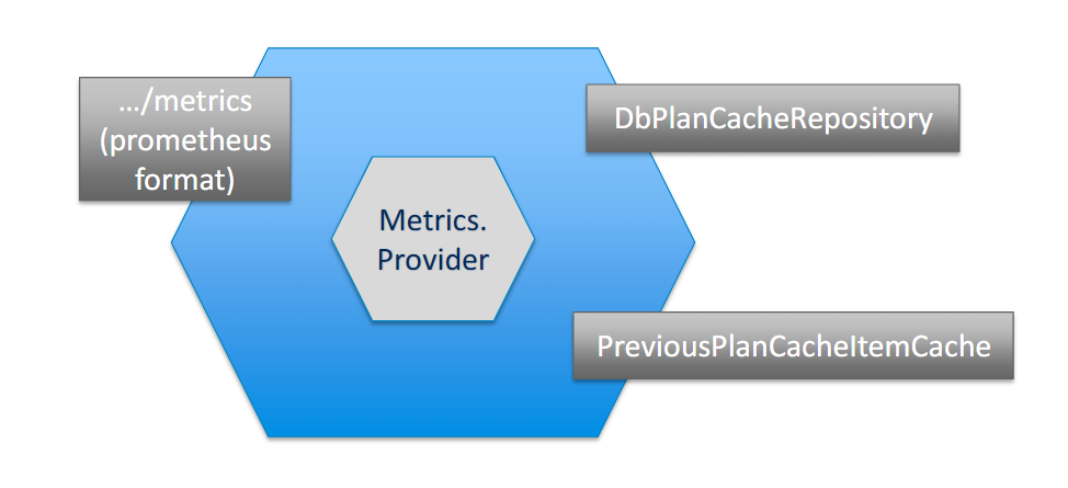 Choosen architecture style was hexagonal, where SqlServer.Metrics.Provider implements the CORE business logic. SqlServer.Metrics.Exporter, that also contains the hosting logic for the REST API, implements proper in/out- adapters. This clear separation from business and infrastructure was mainly influenced by TDD aspects and potential scenarios of reusability in differnt environments. Following figure illustrates it's hexagonal aspect.