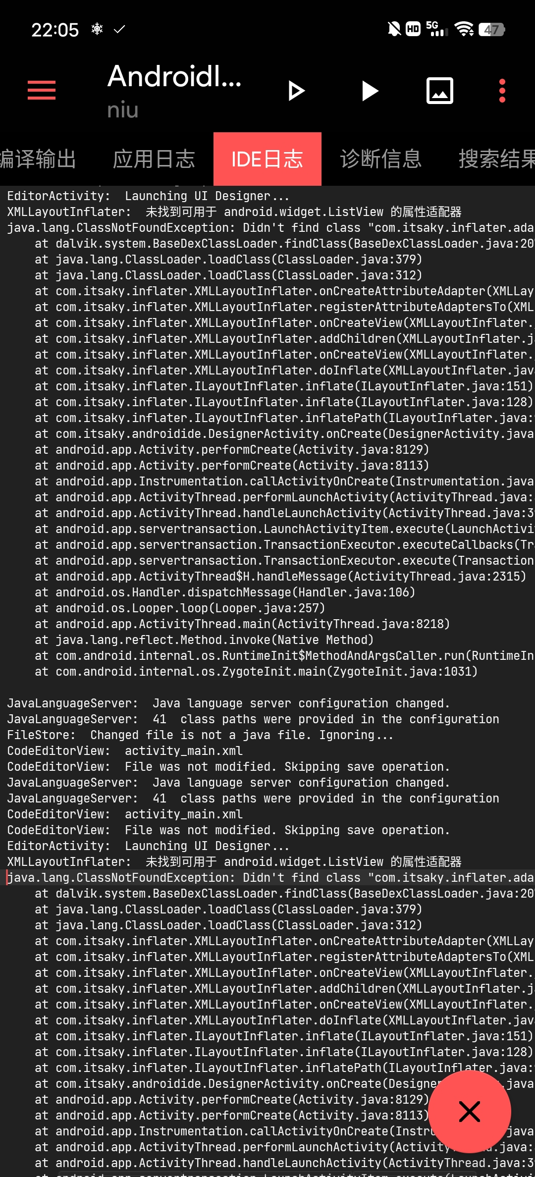 java.lang.ClassNotFoundException: Didn't find class "com.itsaky.inflater.adapters.android.widget.ListViewAttrAdapter"
