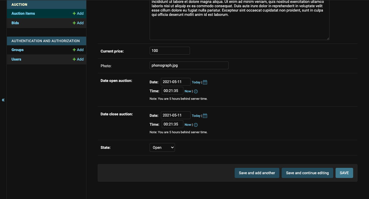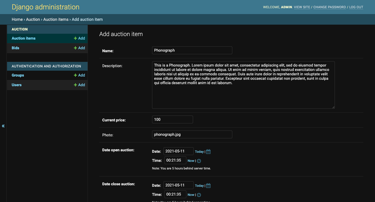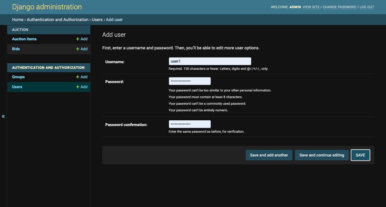 After this, you can enter in the Django admin panel (http://localhost:8000/admin/). Here we are going to create another User and Items