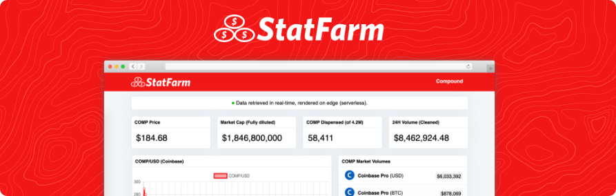 Stat.Farm is a simple Compound Finance dashboard and COMP governance token distribution calculator built with NextJS + Node.JS serverless funtions. It pulls data from a collection of API's (listed below) and presents the information in a simple mobile-responsive grid.