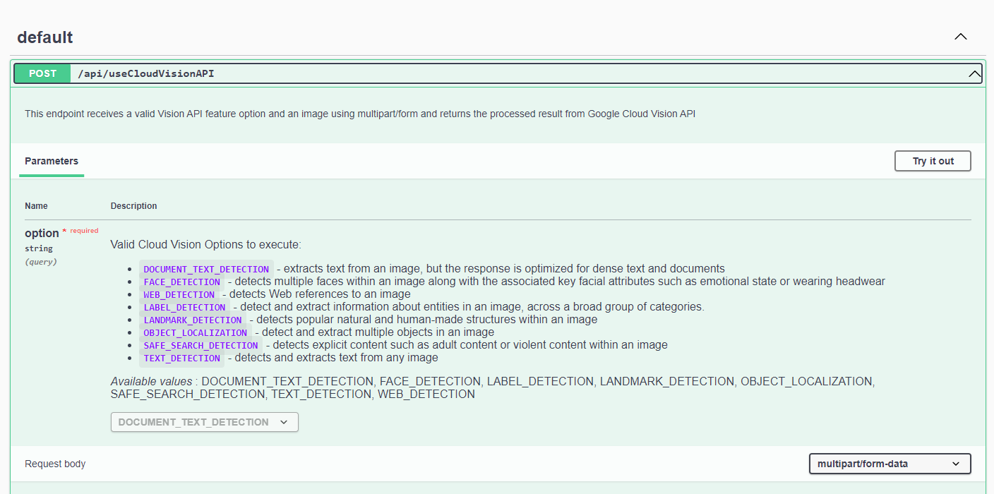 | POST /api/useCloudVisionAPI | Execute a specific Cloud Vision Feature | option=CLOUD_VISION_OPTION | Multipart FormData, with an image field containing a PNG, JPEG or JPG image (Maximum size of 10 MB) |