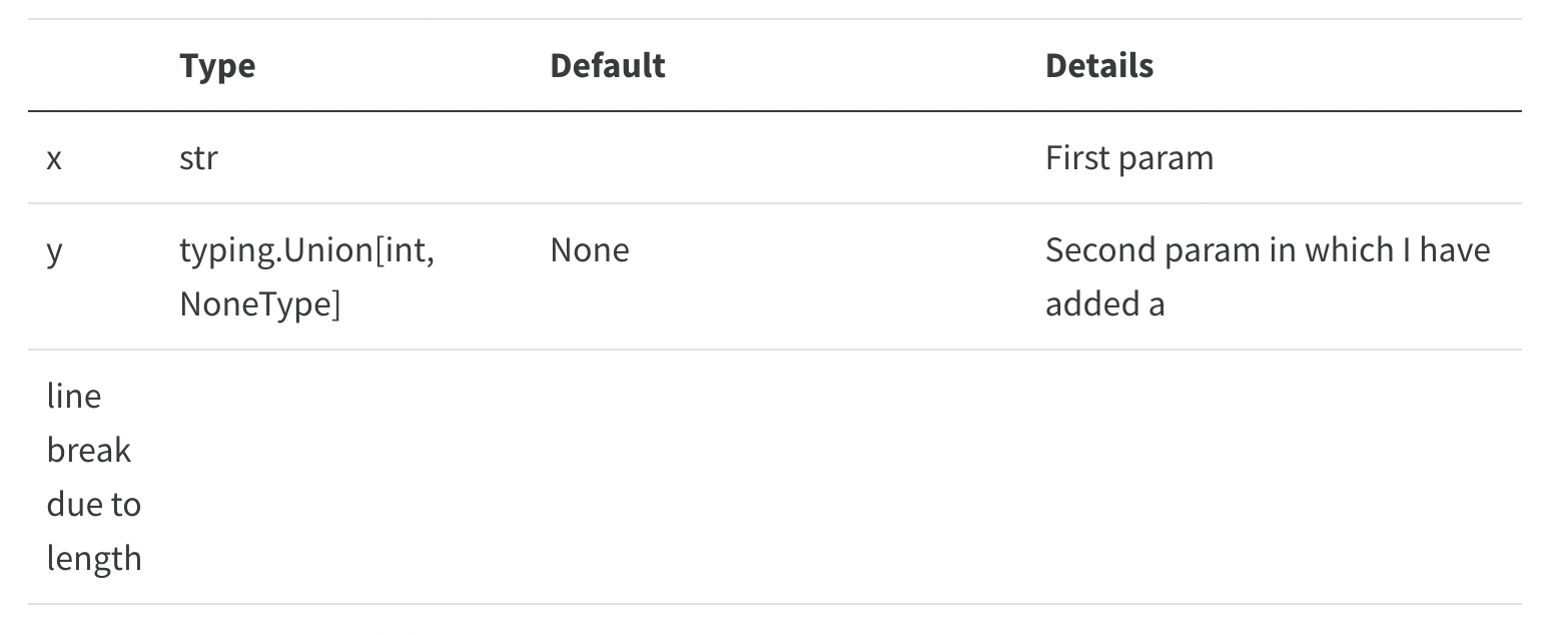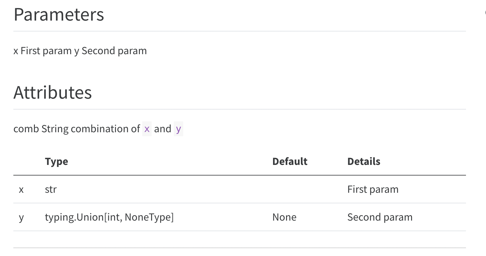 Attributessection (/Users/rafxavier/Envs/poniard/lib/python3.8/site-packages/fastcore/docscrape.py:225: UserWarning: Unknown section Attributes else: warn(msg)). This is probably because fastcore/docscrape does not support it. Is this intentional? What about other standard numpy sections likeRaises? The idea is to document these in notebook markdown? - Types are correctly pulled from the signature and descriptions from the docstings, and everything is rendered nicely in a table. However, a