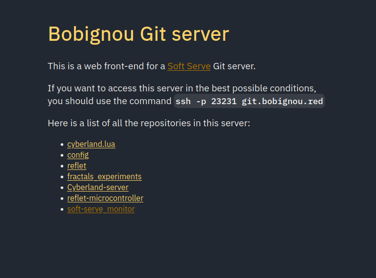 Soft Serve is a very nice git server. It offers a really nice TUI to browse the repositories on the server. Unfortunately, it does not offers a web interface. Here, I want to try to make a tiny web interface to present the git server and list the repositories there.