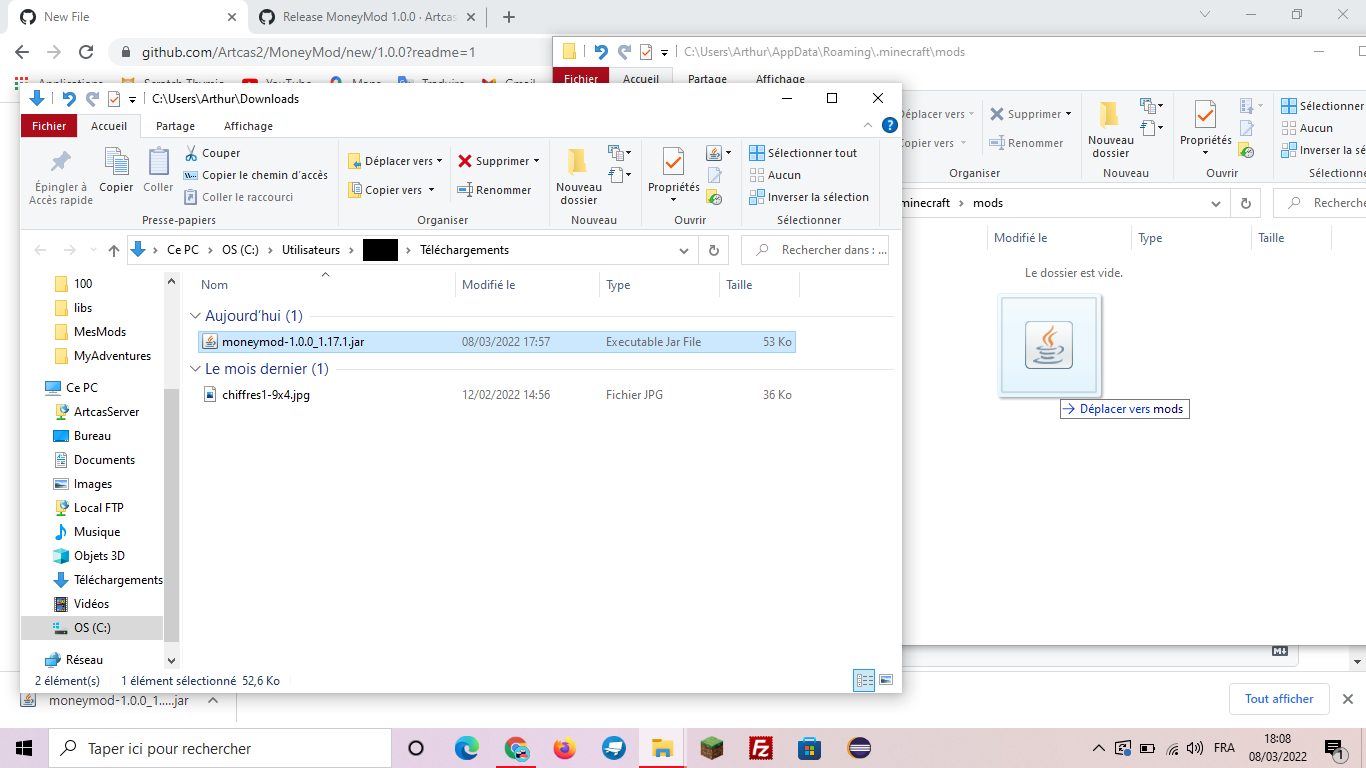 Prenez et glissez le fichier "moneymod-1.0.0_1.17.1.jar" avec la souris d'une fenêtre à l'autre (comme sur les images ci-dessous).
