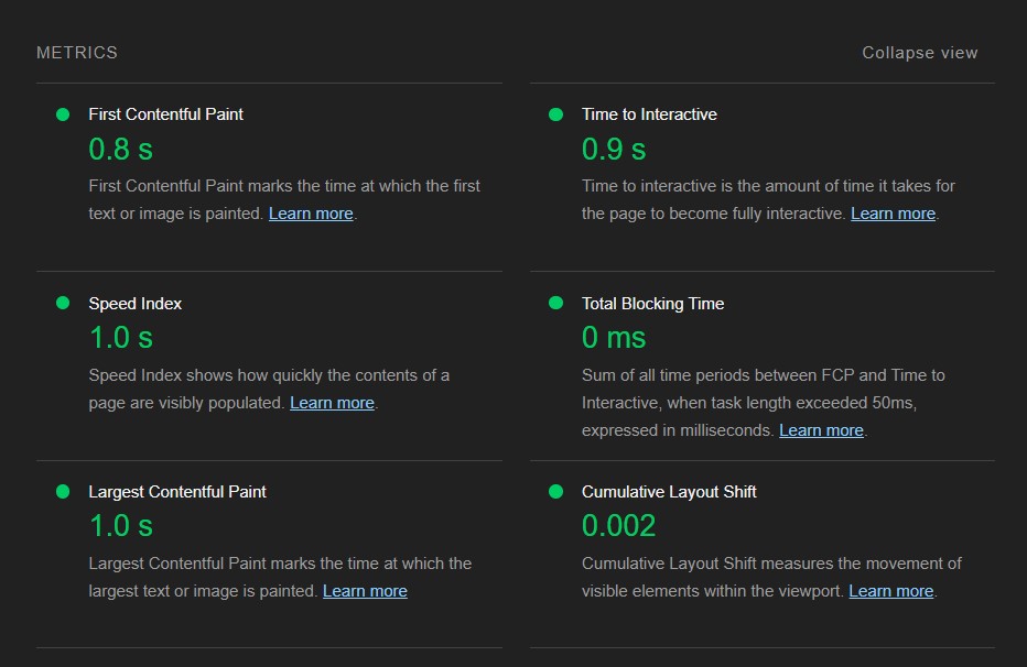 All the calculations are based on the report from Lighthouse Chrome DevTools Report Page load time for desktop is between 0.8 to 1.0 sec.