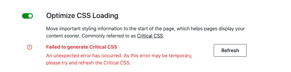 It should not generate any PHP or JavaScript warnings. The dashboard should clearly show that Critical CSS generation was not successful last time, and encourage users to try again.