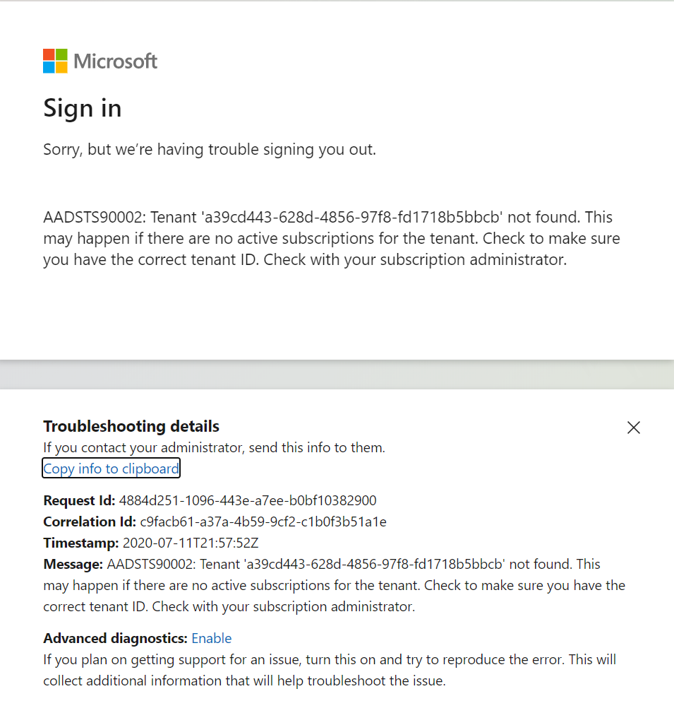 Error AADSTS90002 is displayed with a reference to unknown tenant a39cd443-628d-4856-97f8-fd1718b5bbcb (see screenshot at the bottom).