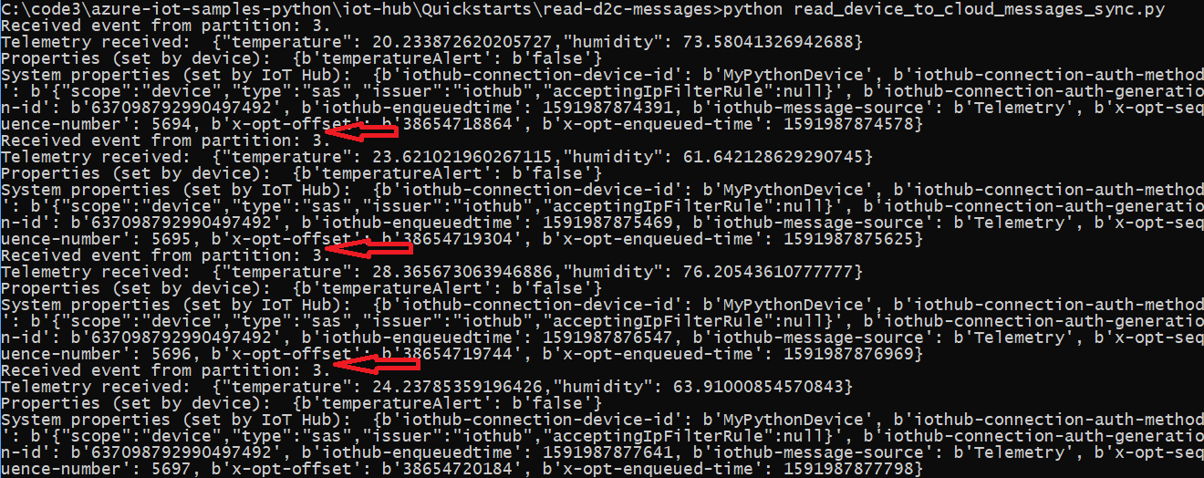 | # az iot hub show --query properties.eventHubEndpoints.events.endpoint --name {your IoT Hub name} | ||
