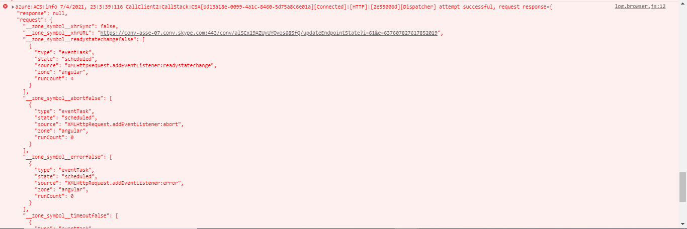 I was trying to implement the azure ACS web feature in my angular application using angular redux. It had been working fine while using the "@azure/communication-calling": "1.1.0-beta.2" package. I had to update the version after deprecated the old version of the sdk. CallClient, Call Agent, join group, etc are working fine for me. After adding the call, it shows the ACS-related issue. The issue was happening after the below code execution.