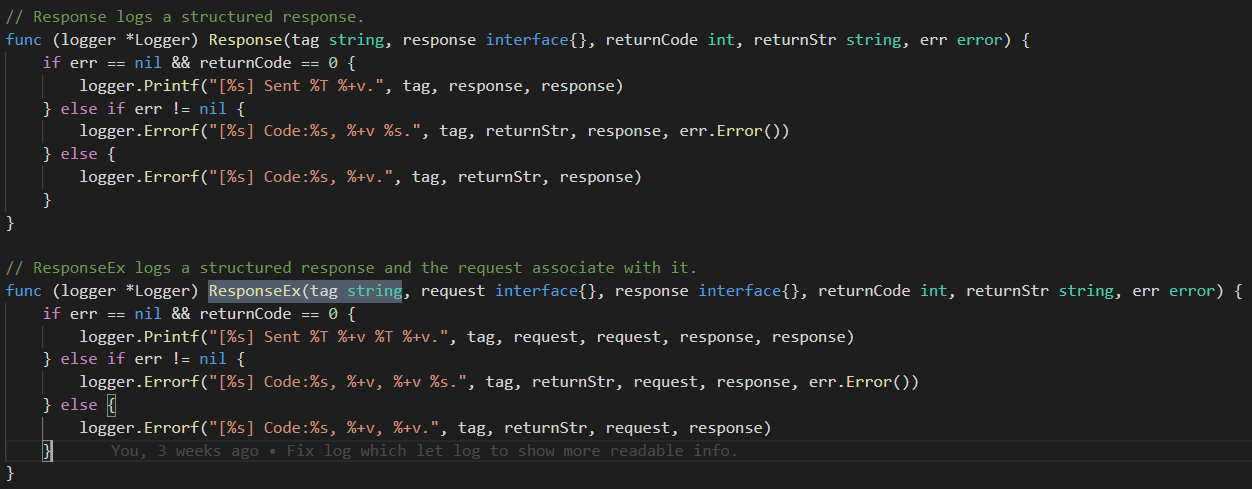 | logger.ResponseEx(service.Name, req.String(), resp, resp.ReturnCode, ReturnCodeToString(resp.ReturnCode), err) |