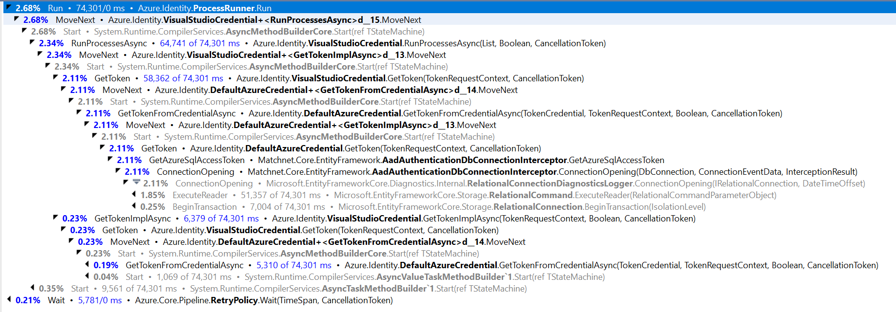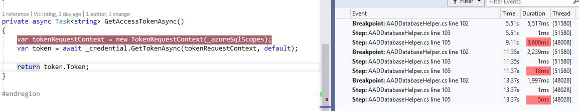 Thanks for the sample link, @christothes. Unfortunately it looks like you can't pass My use case is that I'm running local xunit integration tests that test code use Entity Framework to perform some operations on an Azure SQL database. The tests make about 5 database calls each on < 10 rows of data, pretty simple. However, each test takes about 20s to run inside Visual Studio. In the DbContext I'm using the token based authentication as laid out in Mikaël's blog here: https://devblogs.microsoft.com/azure-sdk/azure-identity-with-sql-graph-ef/ Note that whilst it stores the The difference in my case is I'm using When I profiled the tests I could see that most of the time was spent by the I have a few different accounts logged into Visual Studio for different tenants. I noticed that "Specifies the tenant id of the preferred authentication account, to be retrieved from the shared token cache for single sign on authentication with development tools, in the case multiple accounts are found in the shared token. However, specifying the required tenant id in this field did not alter the performance as far as I could see. I'm nervous about caching the tokens as there's no information about their expiry and caching beyond their expiry would lead to an annoying class of bugs. But is that the way to go? I appreciate any help here. |
