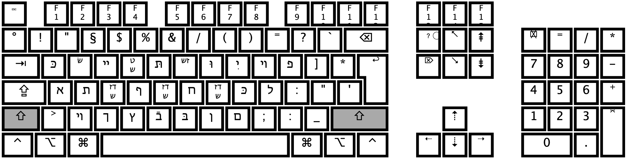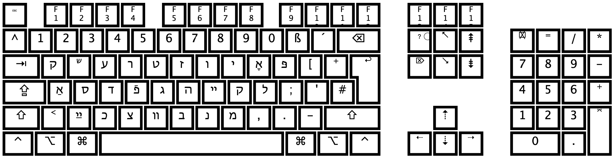 Our version of the Yiddish keyboard layout makes it easier to type Yiddish for anybody who is used to German keyboards. Not only is Z next to T and Y next to X, but punctuation marks and various symbols are also where you'd expect them to be.