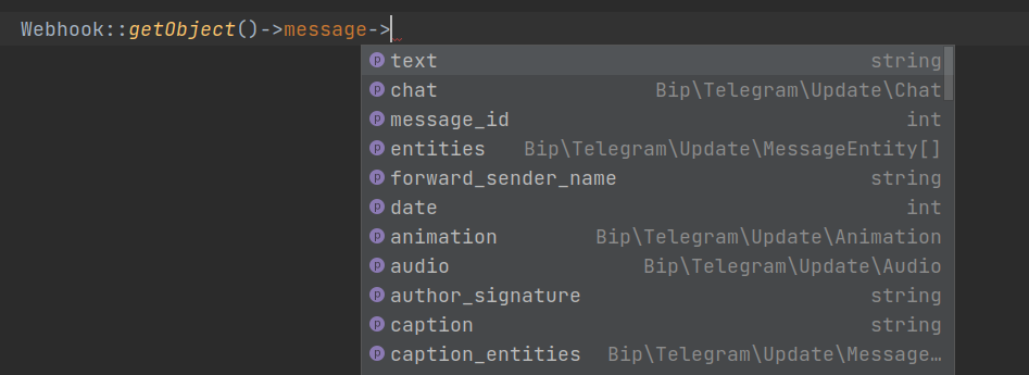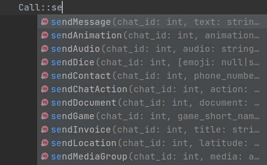 Bip has a Telegram Bot API wrapper for IDE Autocomplete. You can find it in Bip\Telegram\Call