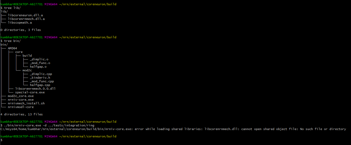 @nrnhines : everything works if build static library of coreneuron (which is default). With shared library if I build as: Then what produced is following and I get link error while running: If I build as submodule then everything works because I believe Cmake of neuron has some extra settings that influence how libraries/dlls are generated. Do you remember what we have done in NEURON to properly generate dlls? |