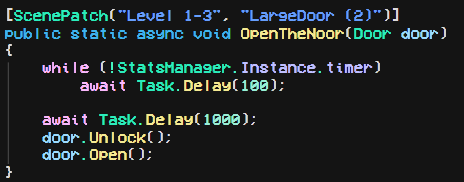 In the class make a new method with [ScenePatch("TARGET_SCENE")] and set target to the desired scene (Level 1-4, CreditsMuseum2, uk_construct, Endless, etc)