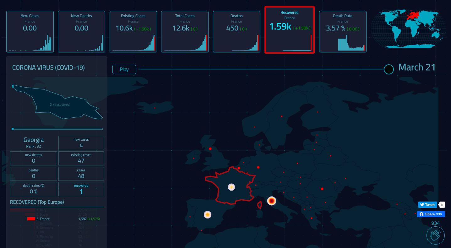 A ma connaissance les autorités françaises ne publient pas cette donnée. Le site Santé Publique France qui est censé informer le public ne la donne pas. JHU n'est donc pour rien dans cette anomalie et je pense qu'il vaut mieux s'adresser directement au pouvoir public français pour avoir cette donnée en Open Data. Les données détaillées par départements, classes d'âge, sévérités seraient également extrêmement utile. L'écart de transparence par rapport à l'Italie qui publie les données sur GitHub est criant. Mon dashboard avec les données du JHU un peu nettoyé pour la France si cela peut vous être utile. |