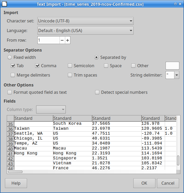The CSV file uses comma i.e. ',' as field delimeter. When the CSV file is imported into Excel, fields are mixed up, as comma is used also to list Canada and US states. For example, for for Santa Clara, CA, US begins as follows (excerpt from time series csv):