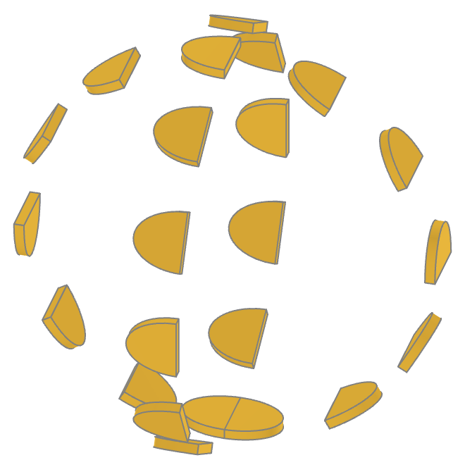 ellipses2 = [cq.Workplane("XY").transformed(offset=Ry(i, (0,0,20)), rotate=(0,i,0)).ellipseArc(3, 5, 0, 180, startAtCurrent=False).close().extrude(1) for i in range(0, 360, 30)]I get arcs of ellipses nicely aligned with the sphere surface: |