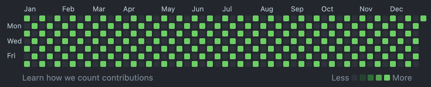 Following this pattern, January will be an odd number month, february will be an even number month, and since the last day of February is the 28th, and the 28th will have commits, March will also be an even number month. The 1st of march should not have commits, but the 2nd should, and so on.
