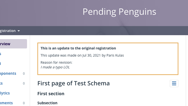 * Foundation: Mirage * mirage factory initial work * model changes * rename schema-response fac to revision fac * partial * More mirage work * Rewire overview-form-renderer to take responses off of registration or revision * query param fun * [ENG-3034] Add version-metadata component and tests (#1239) * Add version-metadata component and tests * Fix test * prelim for edit-revision route * moar * index route redirect + new isPendingCurrentUser field to revision model * Mirage work for revision-actions * Update models * right nav component * moar * more & more * more edit route fun * mobile * Modal for admin requesting more edits * [ENG-3032] Added UpdateDropdown component for Outcome Reporting (#1244) * resolving merge confilcts. * Removing the deleteRevision() task * Removed extra space * added unit and acceptance tests for versioning. * changed template translation string to Updates, added revisions to Mirage. * Changed translation string to Current per UX Consult meeting. * currently ignoring these lint errors; fixed in upstream commits. * linting. * resolving merge conflicts during rebase. * added translation strings to en-us.yml file. * linting. * improved button layout by changing type from show to create, relocated translation string and favicon. * uncommented Args to reinstate the RegistrationModel. * readding the update-dropdown translations. * proofreading, adding logic for admin or initiatedBy user. * replaced let with const for revisions. * removed extra whitespace. * added CSS formatting for list, removed extra revision. * added function call for allRevisions. * added semicolon, removed unused import. * fixed unused imports, functions. * removed unused functions. Co-authored-by: Ashley Robinson <ashleyrobinson@Admins-MacBook-Pro.local> Co-authored-by: Ashley Robinson <ashley@cos.io> * [ENG-3031] Revisions permissions (#1260) * Add permission handling logic to edit-revision * Update draft submission workflow to match revisions * Add more tests * More updates to tests * Fix a whoopsie-doo * Looking for permissions in all the wrong places * [ENG-3036] Updates to registries moderation (#1263) * Updates to registries moderation * Picking a whoopsie-daisy * More updates for moderation * Add tests * removed unused functionality. * Minor updates before demo * Update dropdown work * updated versionNumber to revisionNumber. * updated translation string for component with no revisions. * readded sort(), fixed versionNumber to revisionNumber. * linting. * updates to the version-metadata logic * demo feedback * update-dropdown paginatioon, moderation updates, demo feedback * WIP tests * Improve registrationlist loading state logic * Rename revision model to schemaResponse * Rename revision-actions to schema-response-actions * changed revision language to update(s), shortened length of messages. * Model changes and update-dropdown modifications * reviewState -> reviewsState * [ENG-3218] Revision files widget (#1282) * Hide file add/remove options for revisions * Update some logic * Make test better * CR feedback * Add in a very important exclamation point * [ENG-3242] Add Justification route to registration edit workflow (#1318) * Add Justification route to registration edit workflow * Fix tests * Fix tests and add new transform for revisedResponses * renamed revisionstates * add isOriginal field * Merge develop into feature branch (#1320) * Add bulk upload widget (#1307) * Add `settings` route, nest `notifications` + bulk upload widget under `settings` * Add bulk upload component * Add tests * Bump ember-template-lint * Bump app version to v21.8.0 * Update Changelog v21.8.0 Co-authored-by: Fabrice Mizero <fabrice@cos.io> * Hide pending updates tab in moderation if provider does not allow updates * Change how revisions in progress are shown in Overview page dropdown (#1321) * Change how revisions in progress are shown * Fix logic * Tests * Better logic * Rename revisedResponses to updatedResponseKeys to match API implementation * misc changes (#1323) * Update trigger names to match API * Update moderator reject trigger * change trigger (#1324) * show correct message when isOriginalResponse (#1325) * Show revisions when registration is pending or initial + Fix moderation actions posting to original revision only (#1326) * Update (again) how we show updates * Post moderator decisions to correct revision * Remove unneeded checks to registration state * Cleaner logic * Reroute users out of edit-revision route when needed (#1328) * Reroute users out of edit-revision route when needed * Remove comments * Another comment removed * Add normalize method to SchemaResponse serializer (#1327) * add normalize method to serializer * Serialize file references Co-authored-by: Futa Ikeda <futa.ikeda@gmail.com> * Restructure moderation tab (#1330) * Restructure moderation tab + tests * Fix tests and other borken bits * Minor updates for versioning (#1333) * Refine update-dropdown for moderator mode * Update wording for registration states * Tweak embargo language * Add loading state logic for revisionstate * Tests * Fix moderator mode tests * Revert uunneeded pdate-label logic changes * 50 cents worth of changes * Update feature branch with latest develop. (#1344) * Add bulk upload widget (#1307) * Add `settings` route, nest `notifications` + bulk upload widget under `settings` * Add bulk upload component * Add tests * Bump ember-template-lint * Bump app version to v21.8.0 * Update Changelog v21.8.0 * A11y fixes (#1246) - Ticket: [ENG-2969](https://openscience.atlassian.net/browse/ENG-2969) - Feature flag: n/a ## Purpose Fixes for accessibility issues on the registries discover page, including the navbar. ## Summary of Changes 1. Navbar auth-dropdown gets an aria-label 2. Sort dropdown gets a role 3. Search bar gets an aria-label ## QA Notes Just needs to be run through the selenium tests for accessibility again. * Fix colors of links on the sign-up page (#1267) - Ticket: [ENG-3169](https://openscience.atla