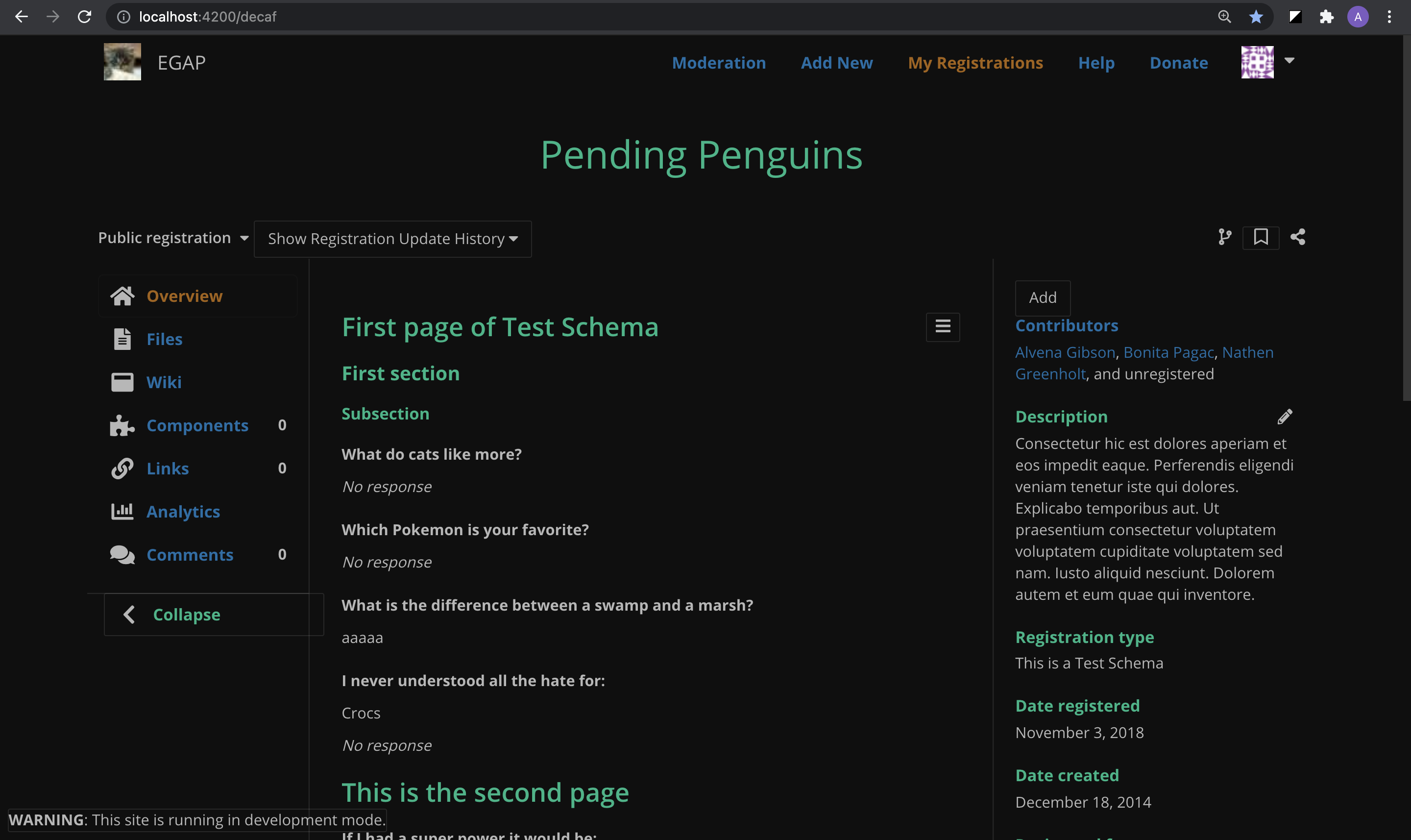 The Registries page should be tested to ensure that there are no discernible changes in the UI other than the width and height of the element; it should not exceed the OverviewTopbar in any way and in general look appropriate for the larger framework. It should also not overly obscure the original Registration page; pagination is currently being considered to handle the display of a large amount of edits.